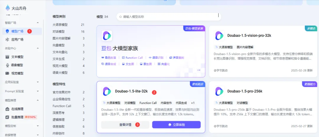 在左侧点击”开通管理”,找到你需要使用的豆包模型,点击”立即开通
