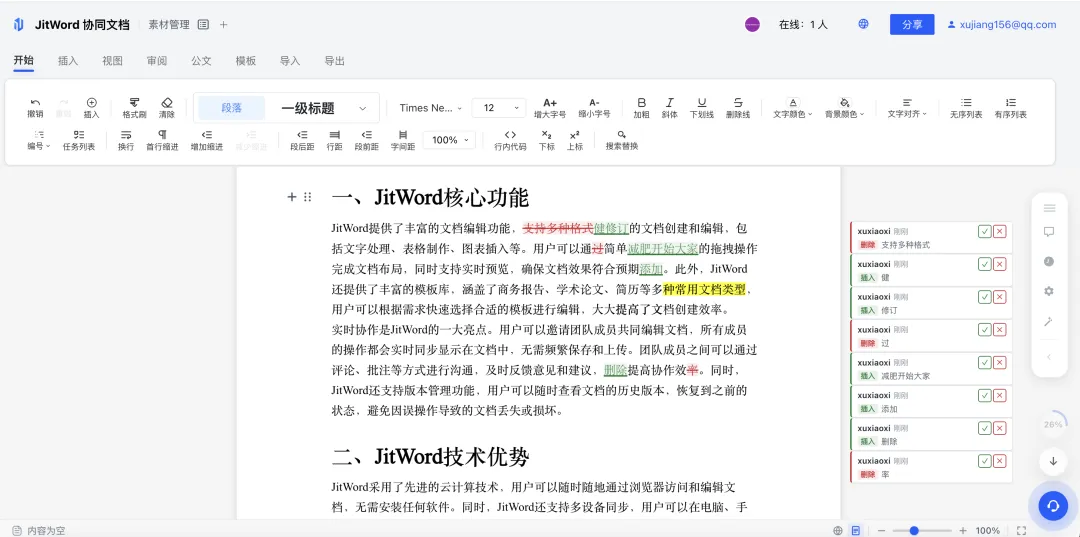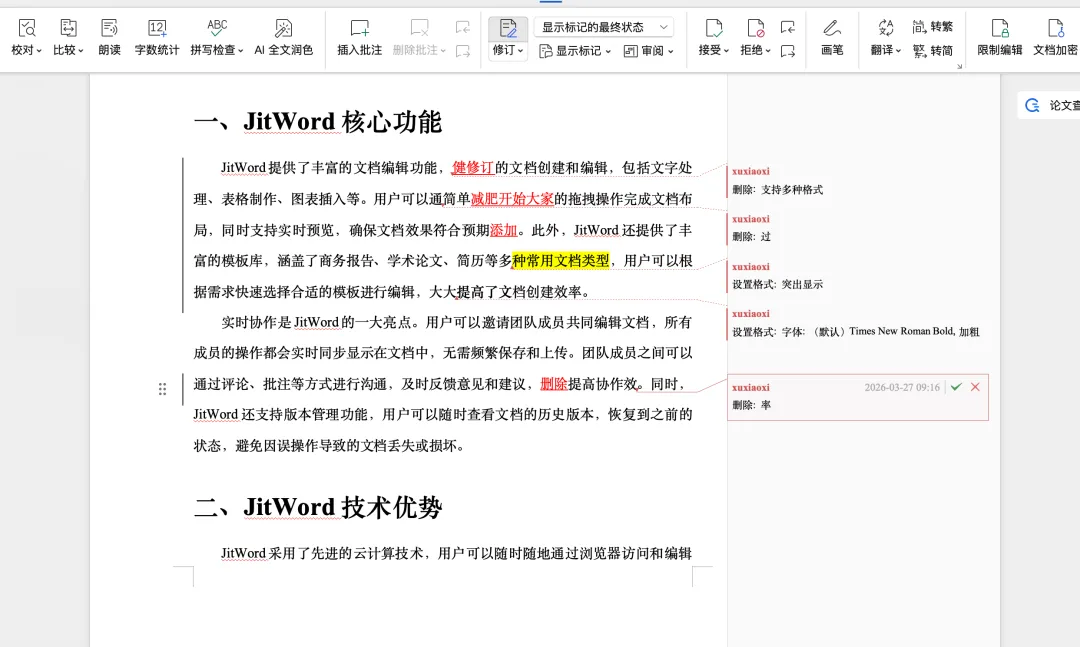 现在,我们可以在 JitWord 里开启修订模式,对文档进行增删改操作时,所有变动都会以痕迹形式保留下来——删了哪些字、加了什么内容、格式哪里调整了,统统可视化呈现,和Word的修订体验基本一致。