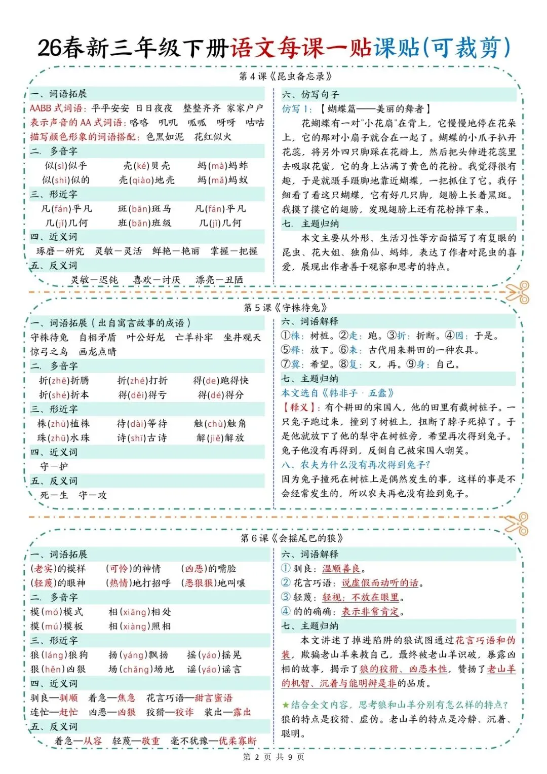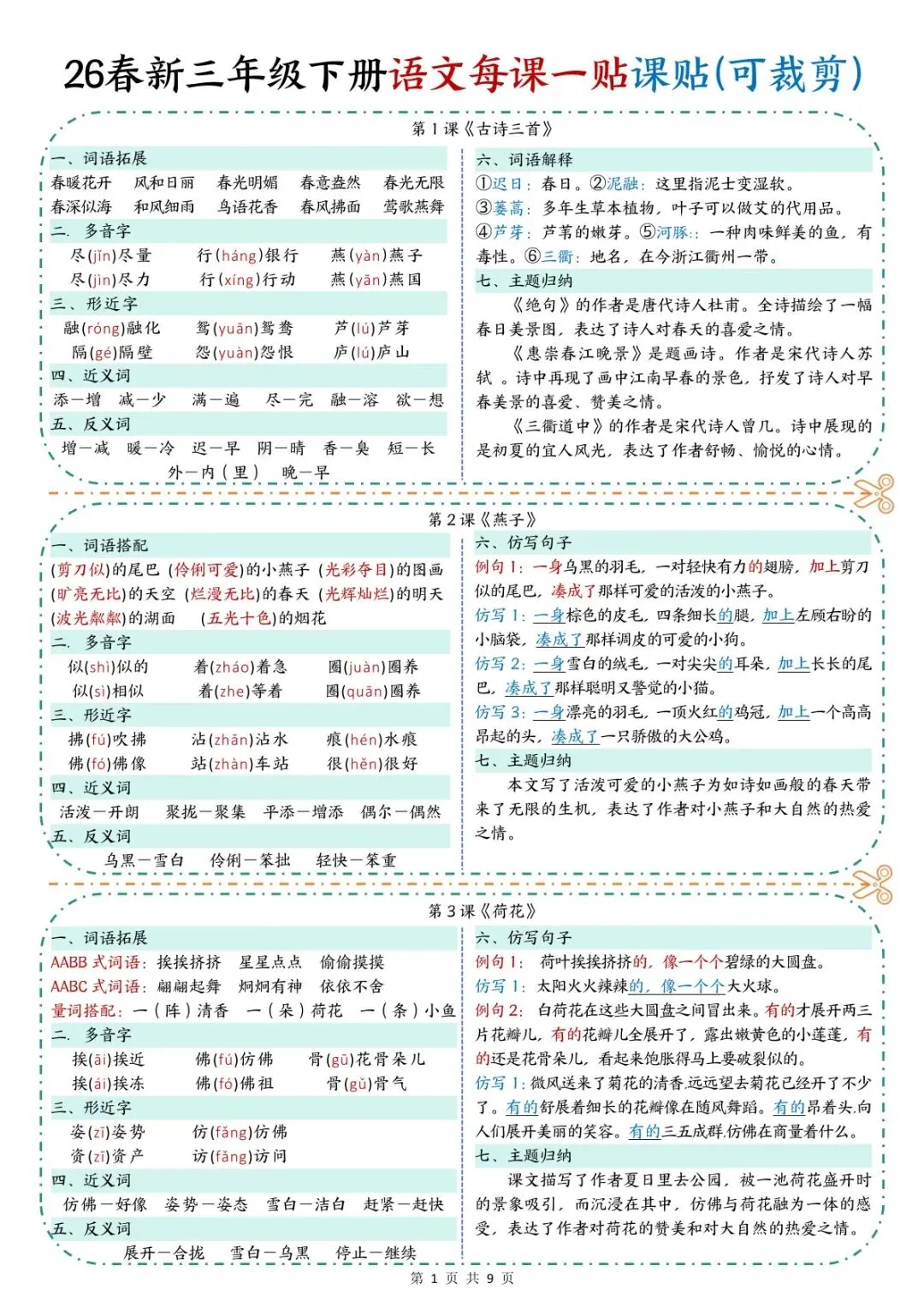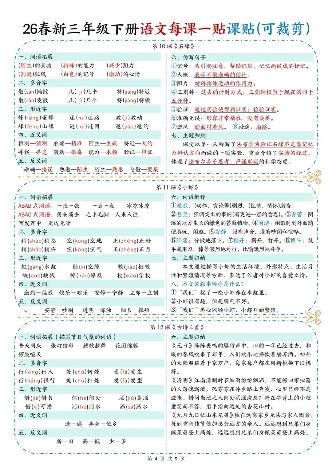 本资料同步部编版三年级下册语文全册课文,采用一课一贴、彩色标注重点的形式,将每课生字词、重点短语、必背句段、课文中心、考点提示高度浓缩。内容精炼、重点突出、一目了然,可直接打印、裁剪粘贴在课本对应页面,方便课前预习、课堂笔记、课后复习与考前速记,是三年级学生夯实语文基础、高效复习的实用学习资料。