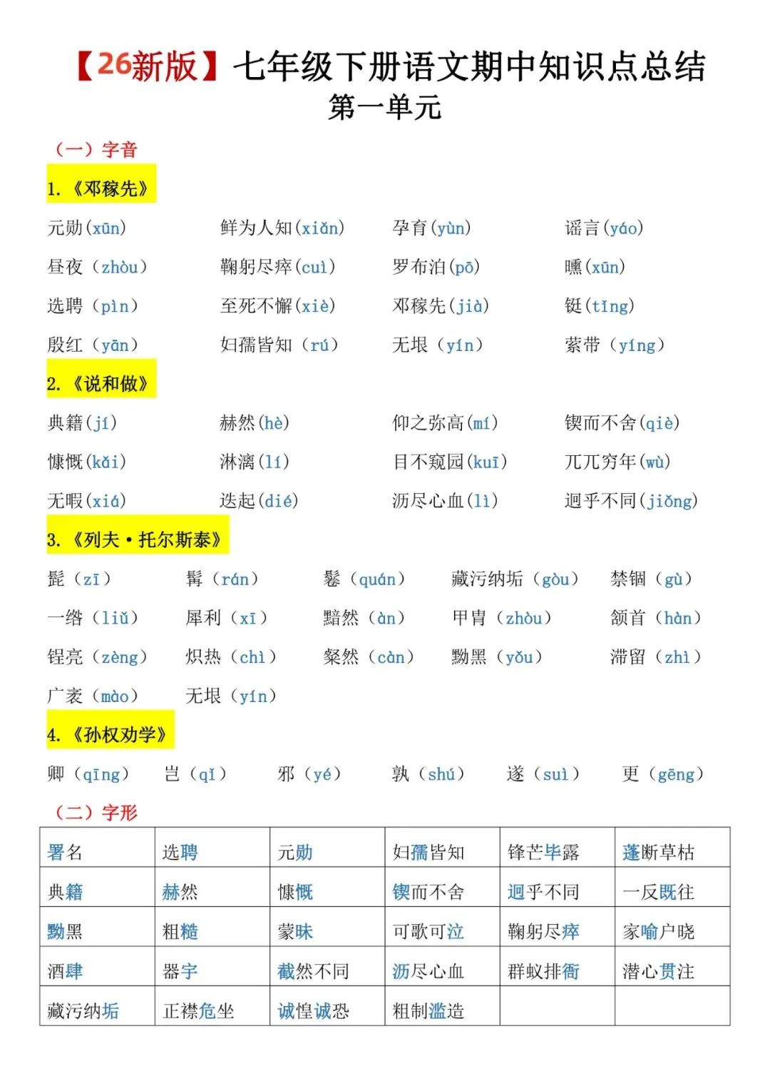 今天老师为大家整理好了:七年级下册语文期中知识点总结电子版可打印
