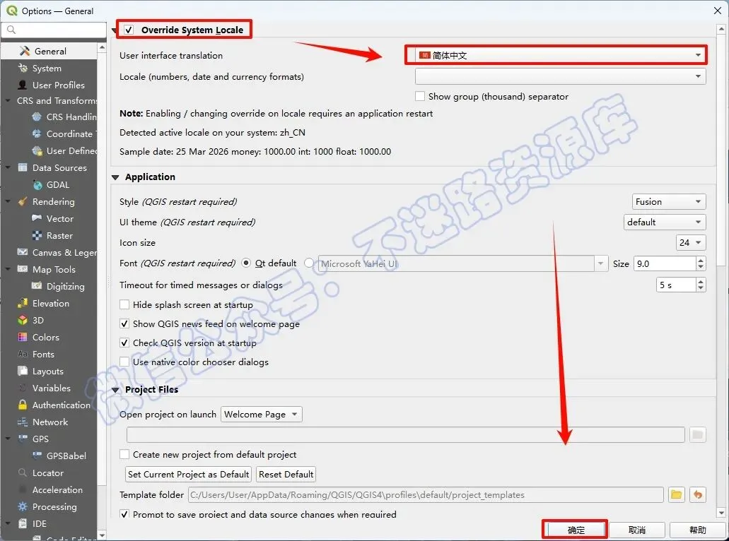 12.勾选“Override System Locale”,将语言改为简体中文,然后点击“确定”