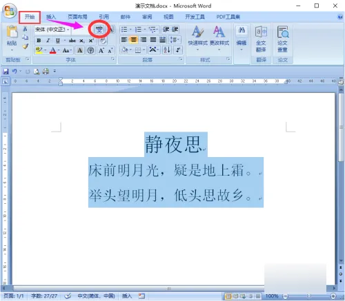 2、选中要加拼音的文字,点击菜单栏“开始”选项卡,再点击字体后面的“拼音指南”图标。