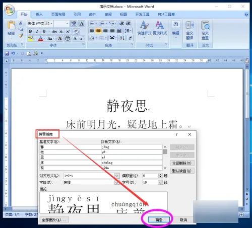 4、点击确定按钮后,此时文字已被成功加上拼音如下图所示。