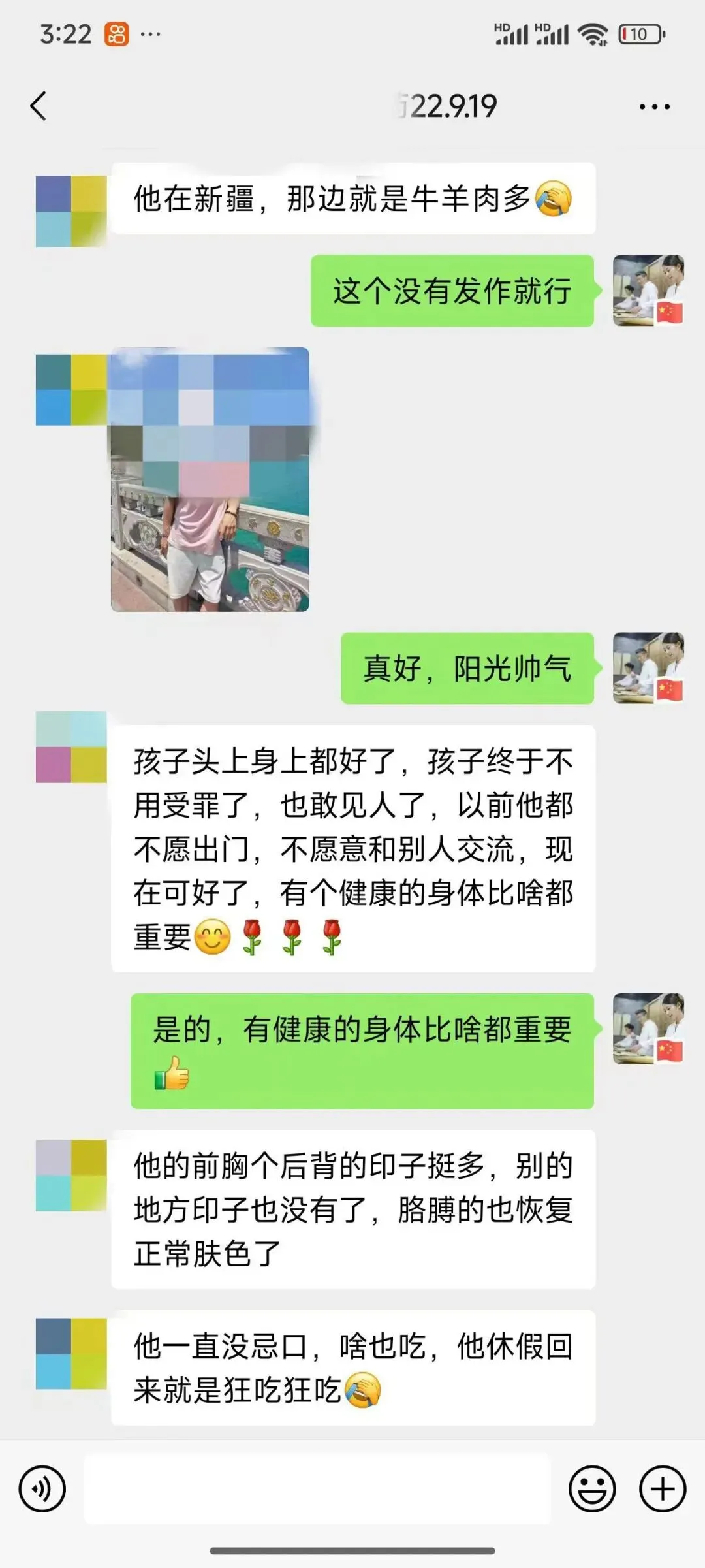 助理回访:患者某男,在新疆学习(或工作,具体不详),得了寻常型银屑病多年,用了很多治疗方法,效果不佳,偶尔浏览公众号得到推荐,用中药浴进行调理,随访恢复良好,孩子也自信了,患者家长非常满意,万分感激。