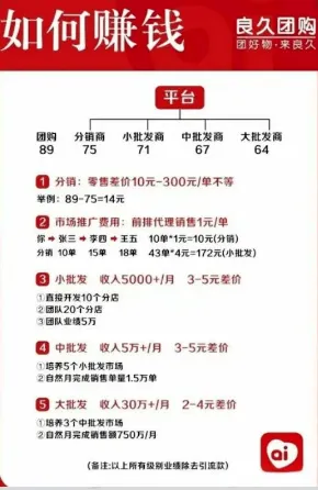 良久采用了 “一级分佣 + 层级批发差价”的激励模式。推荐人每出一单有固定奖励;通过晋升获得更低的拿货价。