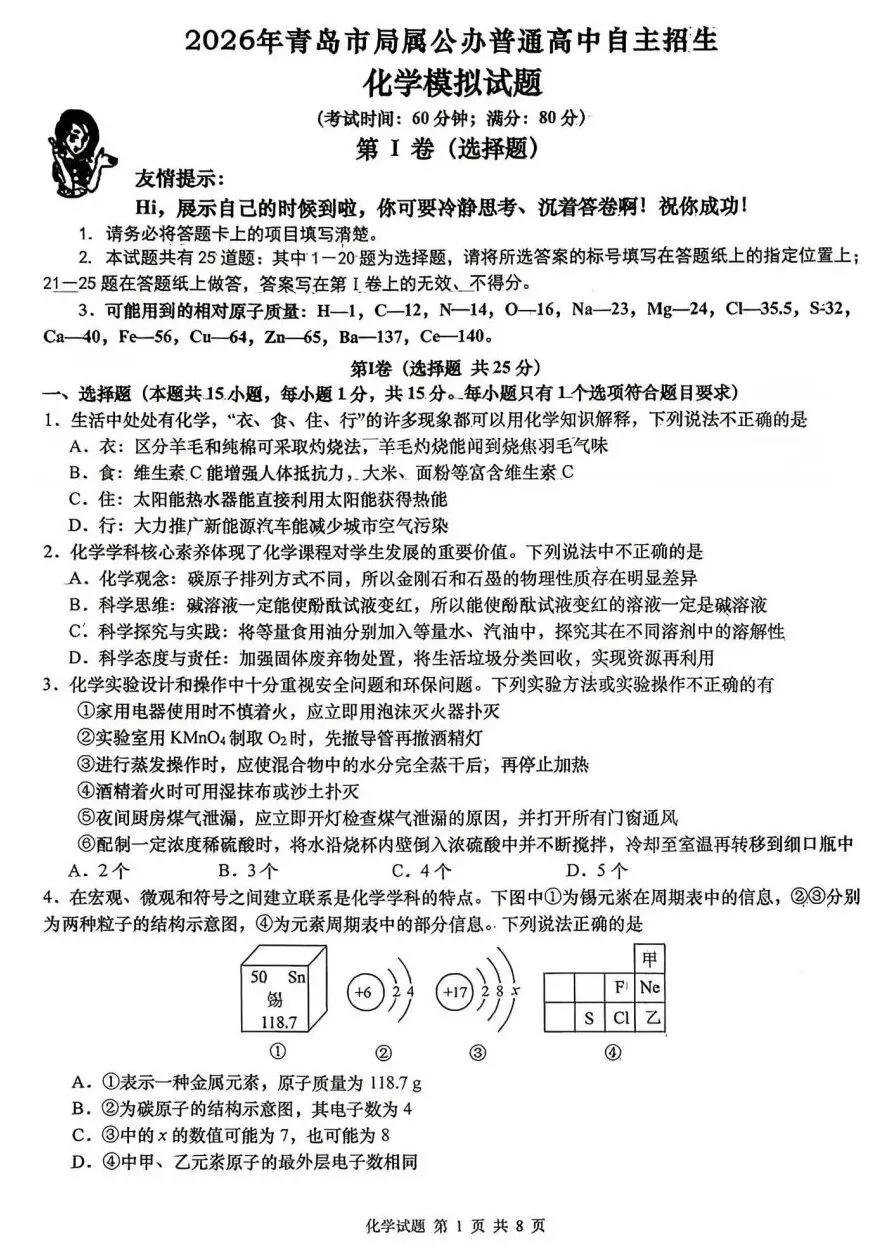 2026青岛市北区自招化学模拟真题(可打印) 各位青岛的家长朋友,大家好,我是黑马老师! 昨天市北进行2026年自招模拟,下面是化学自招模拟真题,初三的家长可以保存到手机打印出来。 2026市北化学自招模拟真题