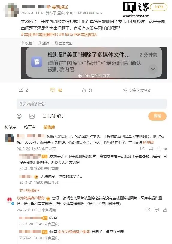 “死循环”式删除: 有用户发现照片被删后,第一时间去手机“回收站”恢复了文件,但只要美团App还在后台运行,删除行为就会再次发生,“就像被人操控一样无法暂停”,直到耗时近一个小时才停止。
