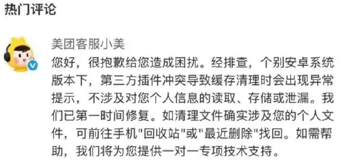 另外美团客服强调,此次问题仅发生在用户本地手机系统层面,美团App不会读取、存储或转移任何用户个人数据,用户隐私及账户信息均未受到影响。