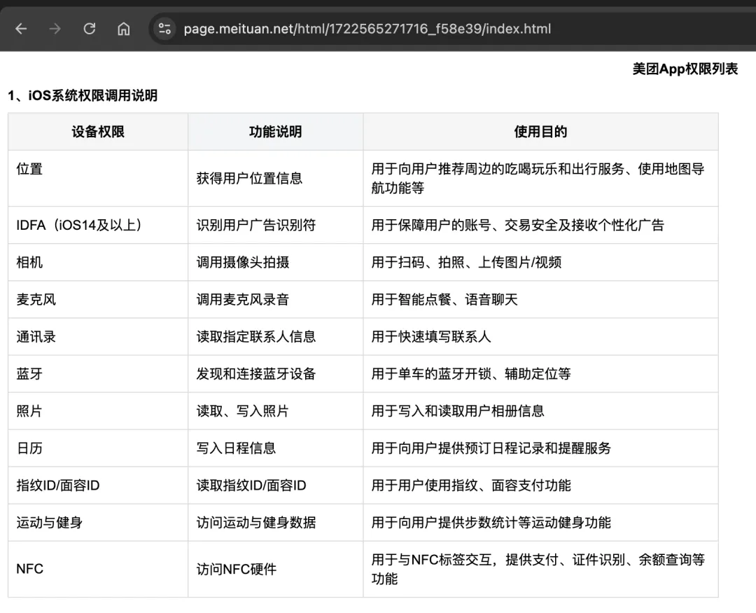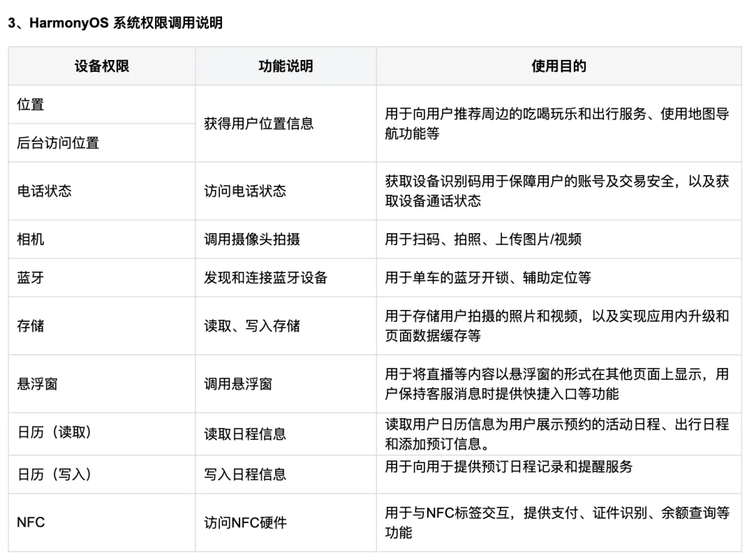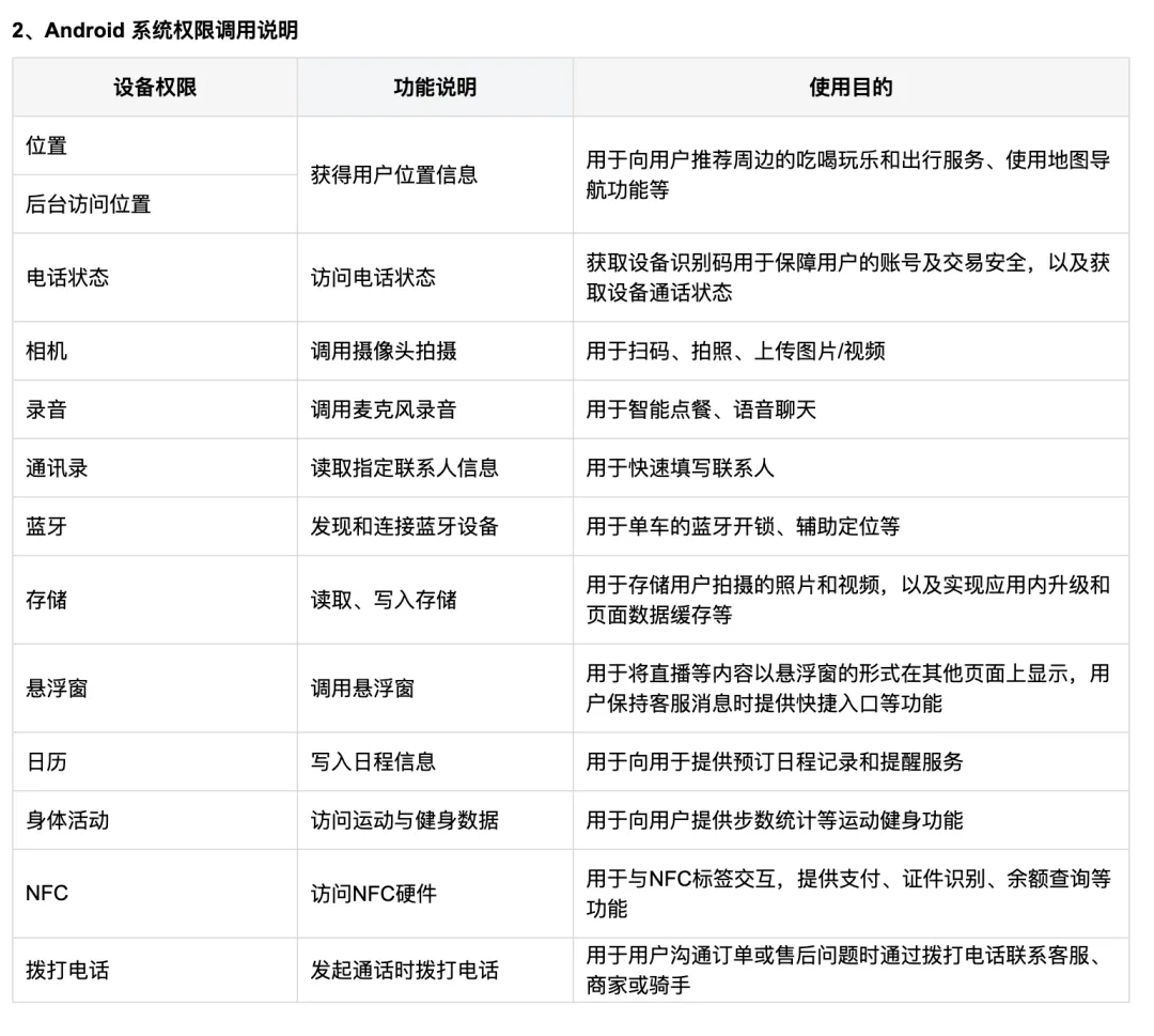 首先从美团APP官方的文件里看下,不曲解讲事实,在“2、Android 系统权限调用说明”没有像“1、iOS系统权限调用说明”一样明确照片或相册,没有单独明确相册权限调用的功能和使用目的。我们也不专业,不知道此处是故意模糊化和法律法规允许模糊化。