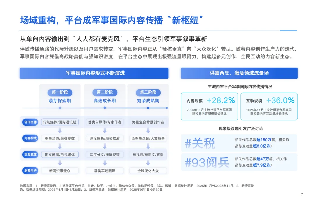 2025年,全球地缘政治格局进入深度震荡期。“关税战”“伊以冲突”等国际地缘事件频发,军事国际内容已超越垂直兴趣,跃升为国民级的“认知刚需”。在这一背景下,军事国际内容不仅是个体洞见世界的桥梁,更成为公众构建世界观的重要媒介。