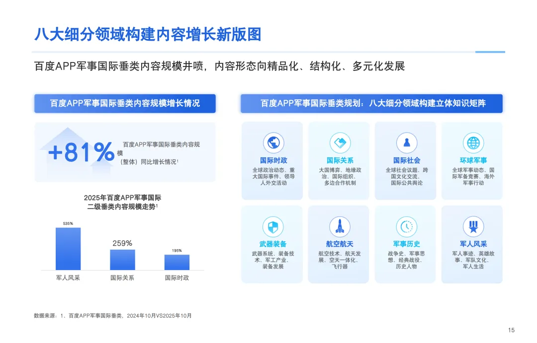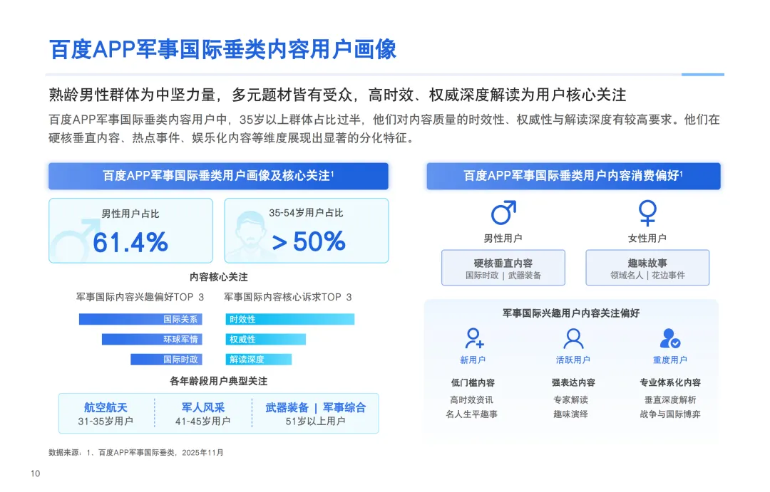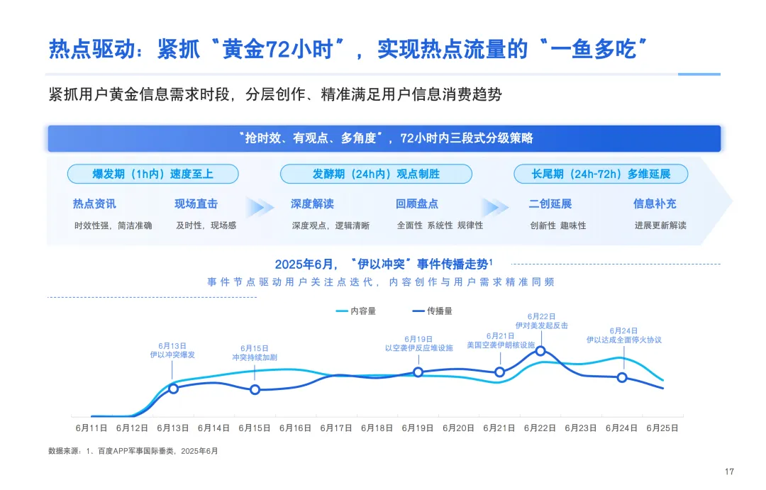 这份《2025百度APP·军事国际垂类内容创作白皮书》,旨在透过现象洞察本质,剖析创作背后逻辑。报告不仅梳理了权威专家与兴趣创作者差异化的内容路径,更深度拆解了全网刷屏时刻的热点法则——从紧抓“黄金72小时”到“一鱼多吃”的精细化策略,助力创作者实现流量的最大化转化。与此同时,白皮书还重点展示了AI如何重塑内容生产方式与表达边界,将内容创作从“拼素材”推向“造场景”,让军事国际内容叙事更具沉浸感与表现力。