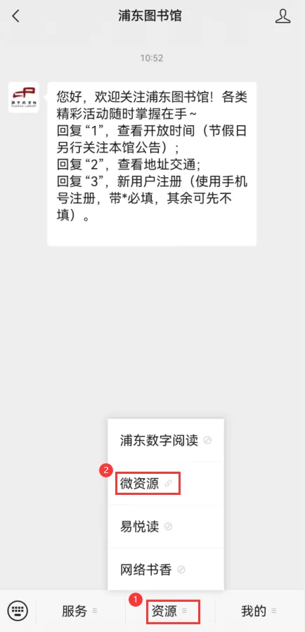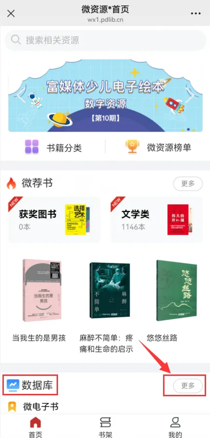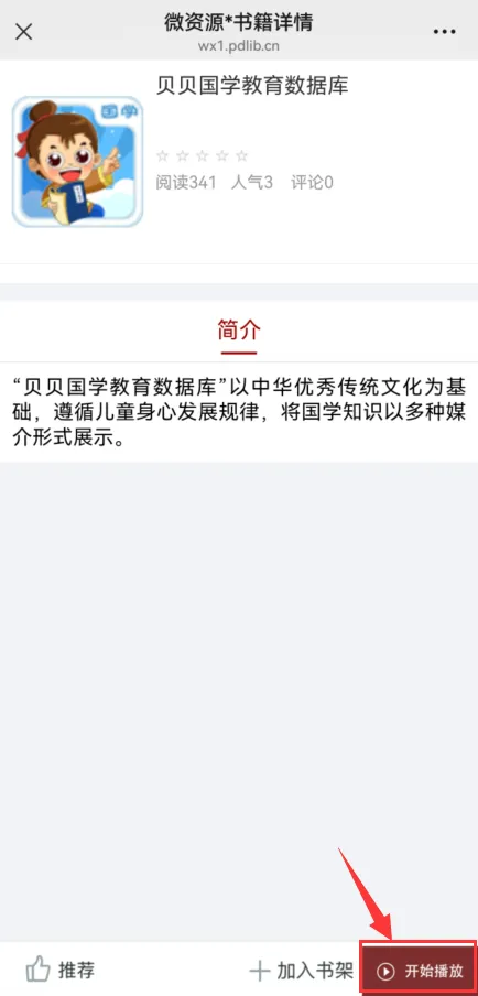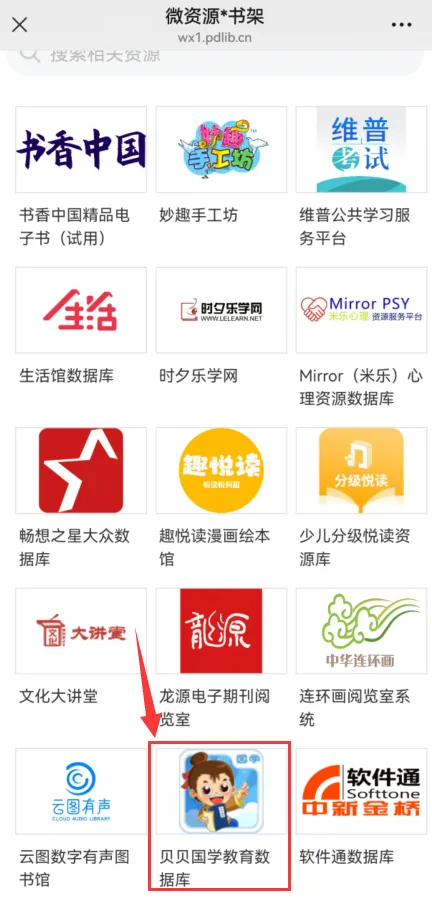 关注“浦东图书馆”微信公众号,点击菜单栏【资源】-【微资源】,进入图书馆登录界面进行登录或注册,找到数据库点击【更多】,点击贝贝国学-点击开始播放访问小程序。