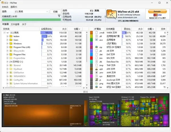 3、可视化树形图让大文件和大量小文件一目了然。