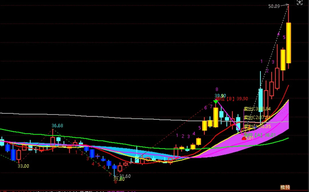 卖出C3:=DRAWLINE(VV,CONST(卖C3),CURRBARSCOUNT=1,卖C3,1),COLORMAGENTA,DOTLINE;
