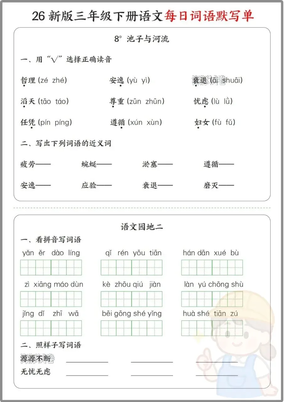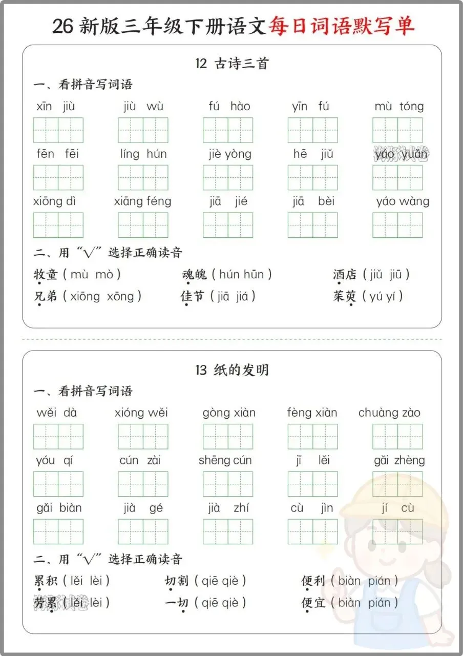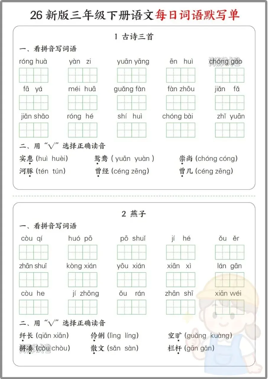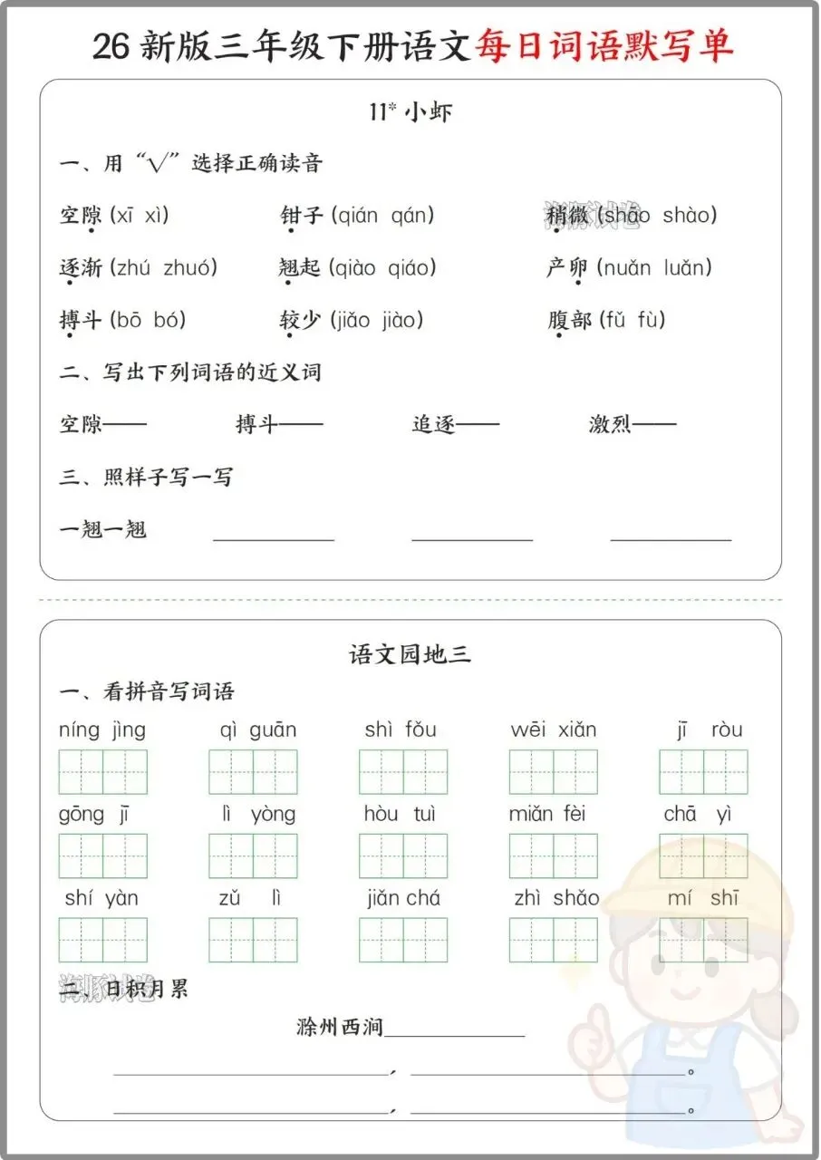今日份分享:26年三年级下册语文《每日词语默写单》。同步全册课文,按单元拆分看拼音写词语、选择正确读音、选字填空、日积月累等题型,还附完整参考答案,方便家长批改。