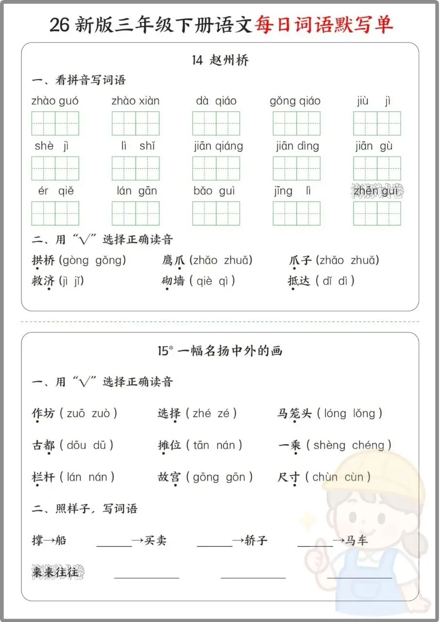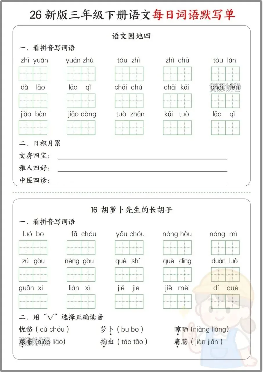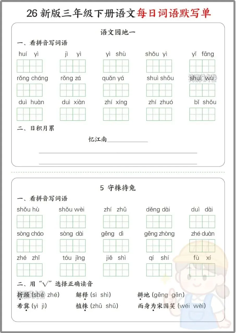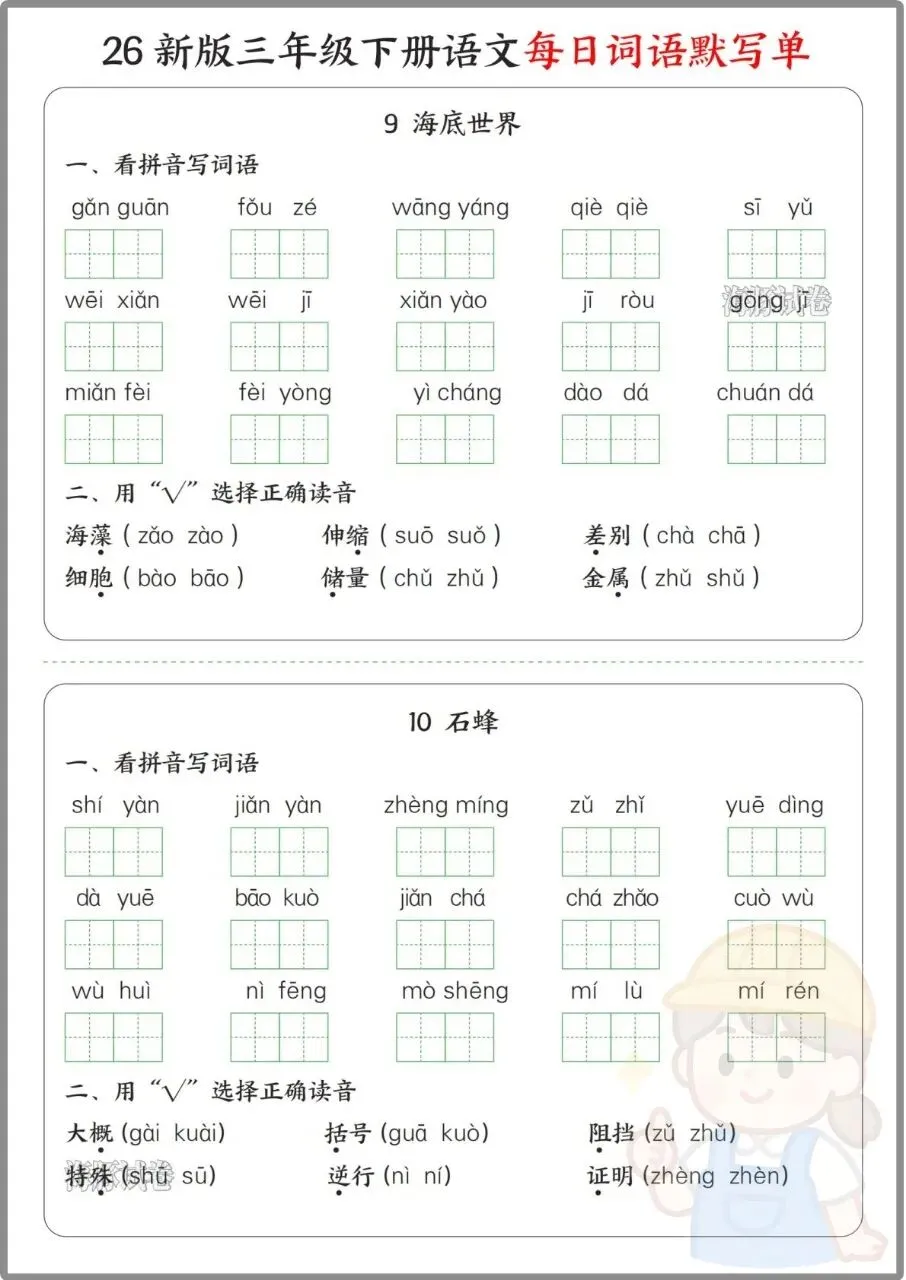 今日份分享:26年三年级下册语文《每日词语默写单》。同步全册课文,按单元拆分看拼音写词语、选择正确读音、选字填空、日积月累等题型,还附完整参考答案,方便家长批改。