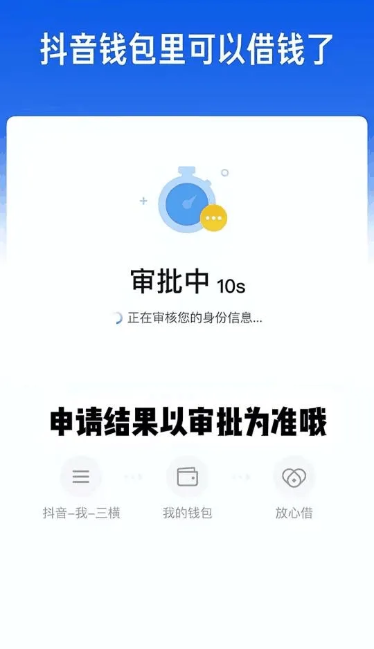 以抖音为例,操作路径超简单:打开抖音→进入「我」页面→点击右上角「三横线」→找到「我的钱包」→直达「放心借」,按提示填写资料、完成核验即可提交申请,全程线上操作。