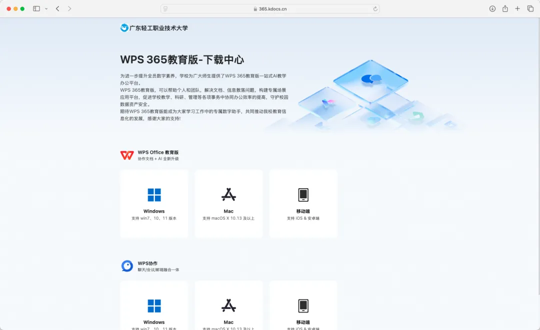 请下载安装广东轻工职业技术大学专属WPS 365教育版客户端: