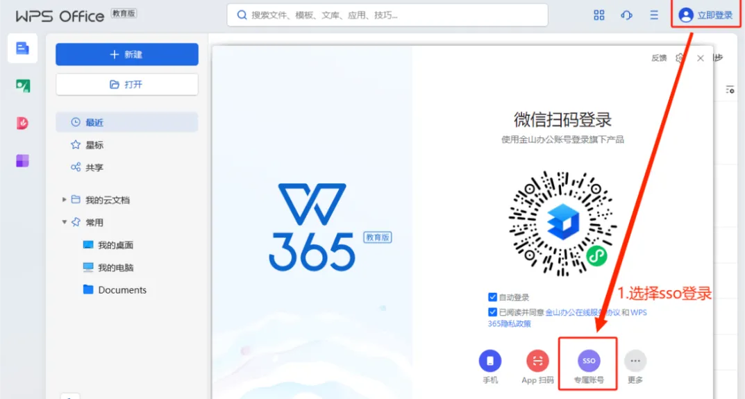 下载安装WPS软件后,打开WPS软件首页,点击登录-sso专属账号,输入 gdqy,将自动跳转到广东轻工职业技术大学的统一身份认证界面,输入您的学/工号和密码,登录后即可使用。