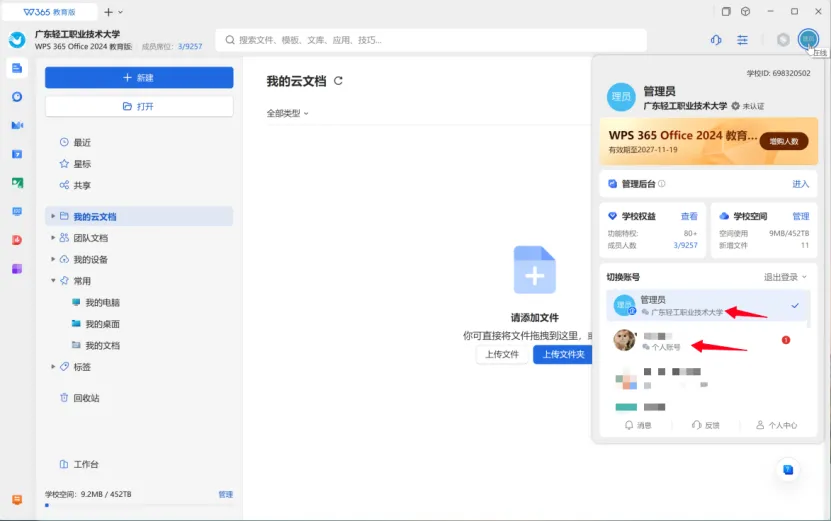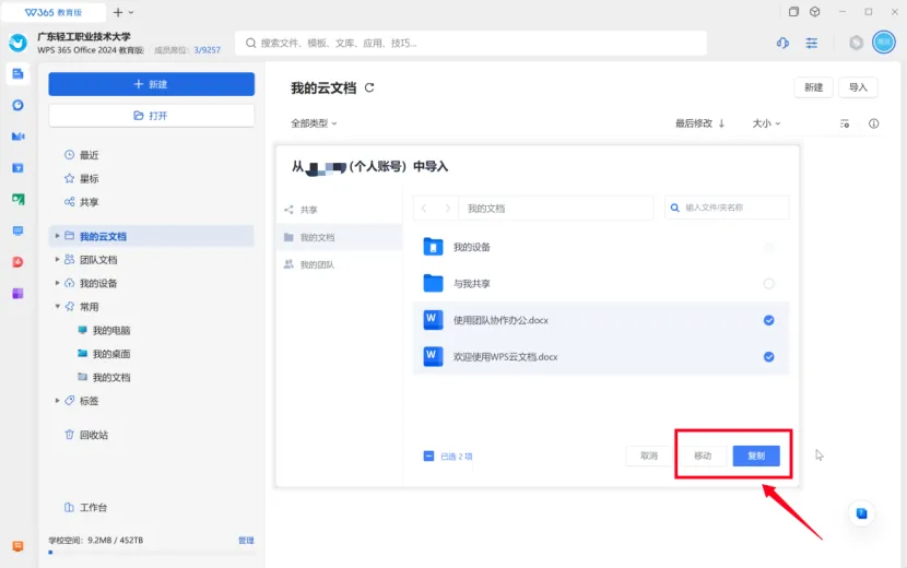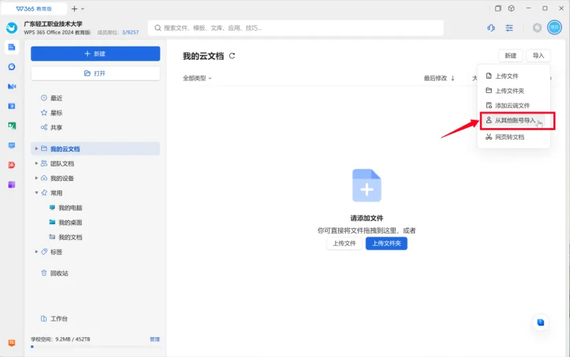 同时登录教育版账号和个人版账号,在教育版账号下,点击“我的云文档”,点击右上角“导入”–“从其他账号导入”,按需进行操作即可。