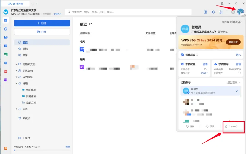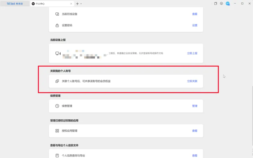 若个人已有超级会员,可同时登录教育版账号和个人版账号,点击【个人中心】–【关联我的个人账号】–【立即关联】,即可在广轻大WPS 365教育版账号上同时享有超级会员权益。