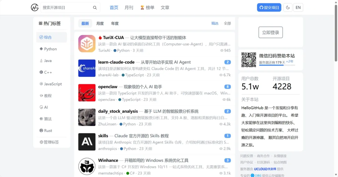 完全免费开放,致力于降低开源参与门槛。特色包括:每月更新的《HelloGitHub》月刊、分类清晰的开源项目库、新手友好的项目推荐机制,以及活跃的开源交流氛围。每月精选实用/有趣的开源项目,附带中文说明,开发者可自荐项目或参与开源讨论。