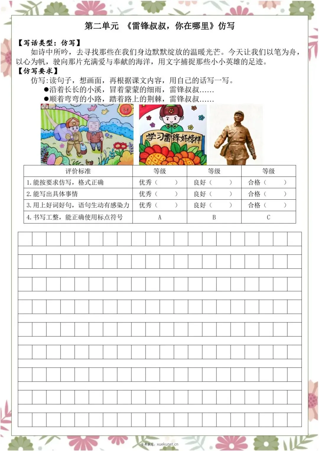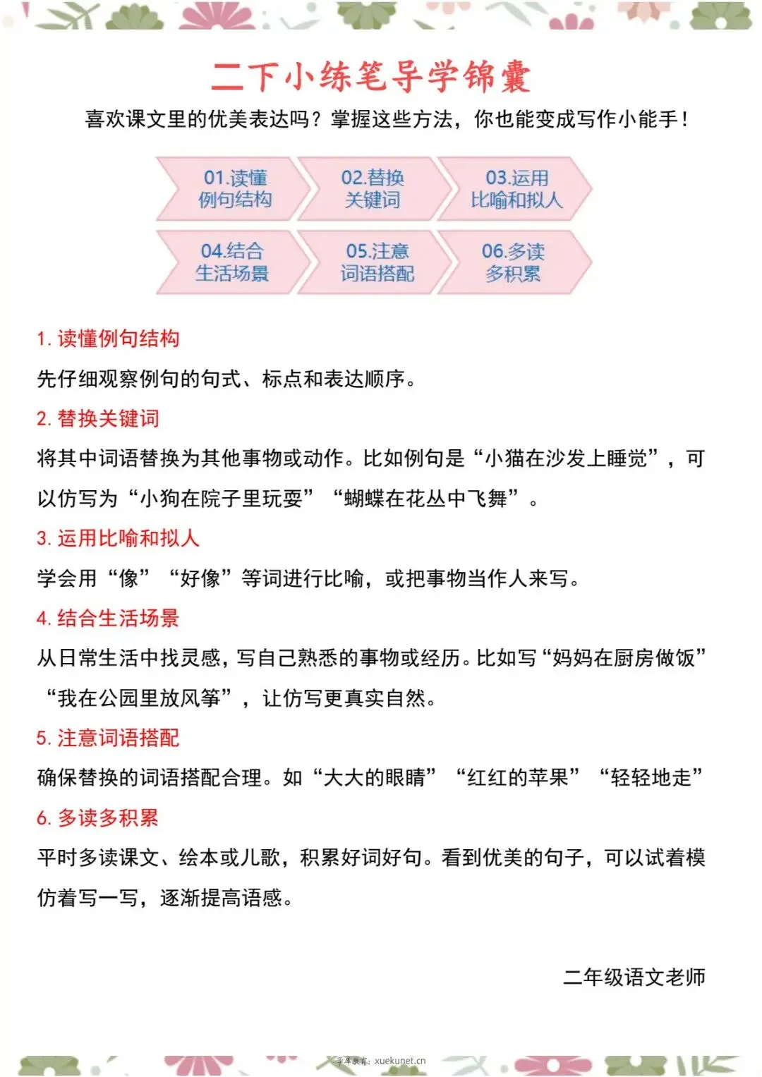 这份二下课内小练笔,教给孩子读懂例句结构,学会替换关键词,运用比喻和拟人写作手法,结合生活场景让仿写更自然,同时教会了孩子词语搭配,为孩子练习写作提供了丰富的写作素材,旨在帮助孩子丰富自己的语言储备,积累句子,熟练句式,提升表达能力,为将来更深层次的写作打下良好的基础,需要的家长和老师可以保存让孩子练一练吧!