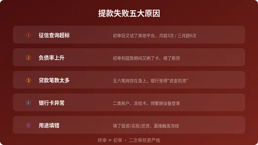 终审才是你能不能用这笔钱的关键。当你点“提款”的时候,银行系统会再二次审核,重新过一遍你的征信,如果你的征信跟初审有很大出入,都会影响终审的结果。