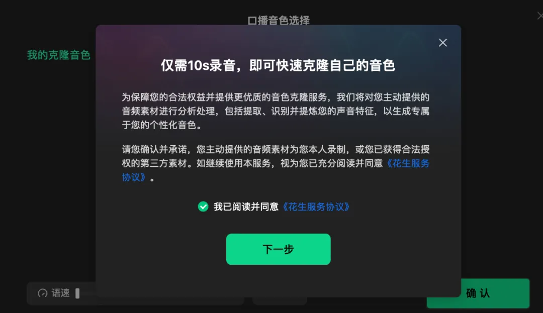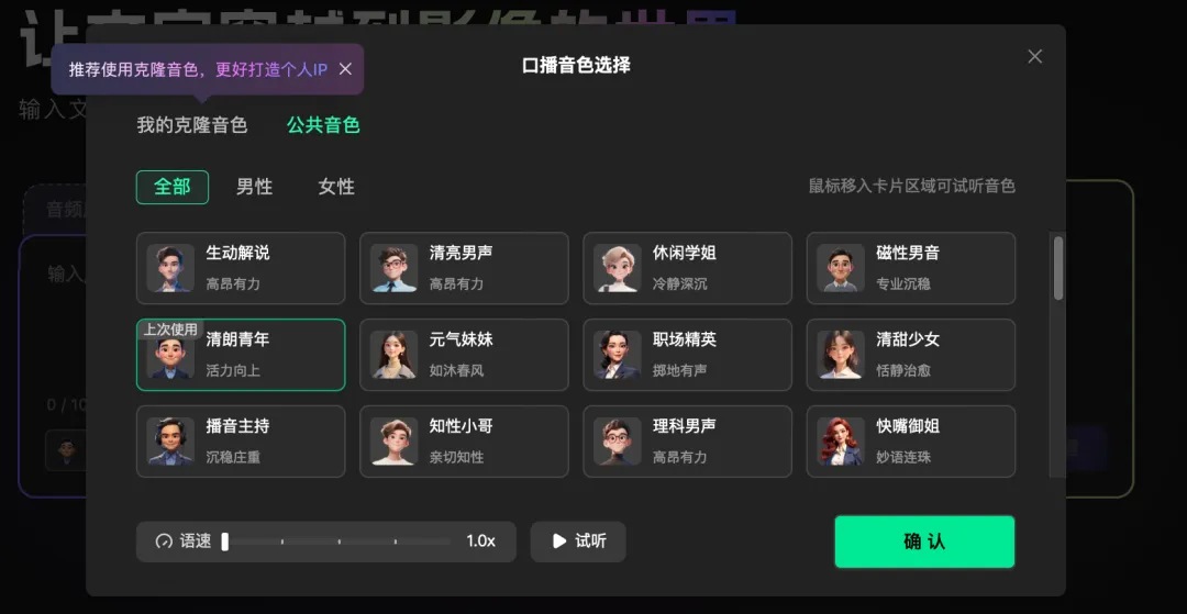 然后点击右下角,有个选择音色的选项,可以克隆自己的声音,也可以选择公共音色。克隆声音要特别说一下,仅支持直接录音克隆,不支持其他音频上传克隆。