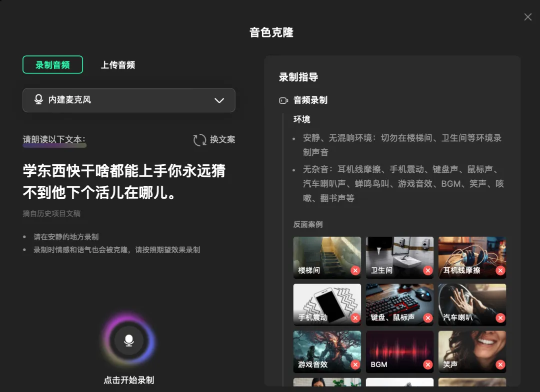 如果音色比较好的同学,或者想长期使用自己的声音的同学,就可以使用克隆声音,这样下次就不用重复朗读了或者配音了,直接使用克隆声音代替自己的配音。