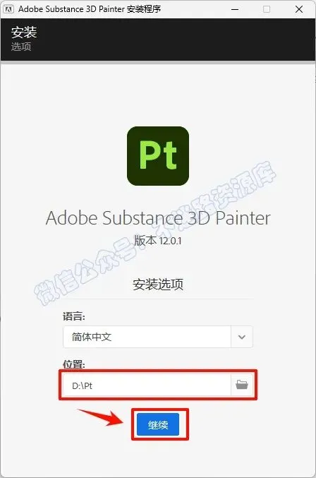 3.选择软件安装路径,建议和教程中的保持一致,本例安装在D盘(安装路径不要出现中文),点击“继续”