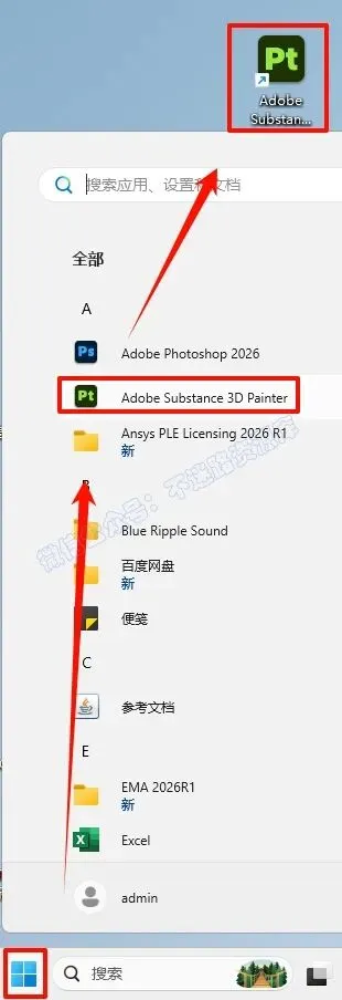 6.点击“开始“菜单栏,点击“所有应用“,找到“Adobe Substance 3D Painter“软件,鼠标左键拖拽到桌面上即可创建桌面快捷方式