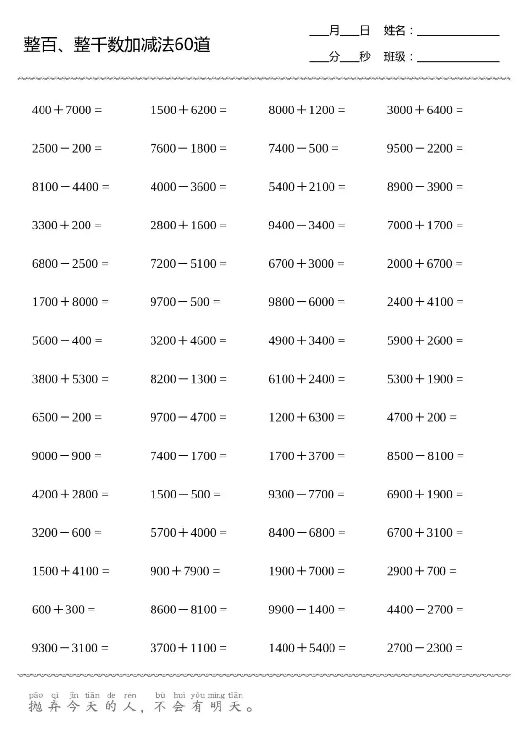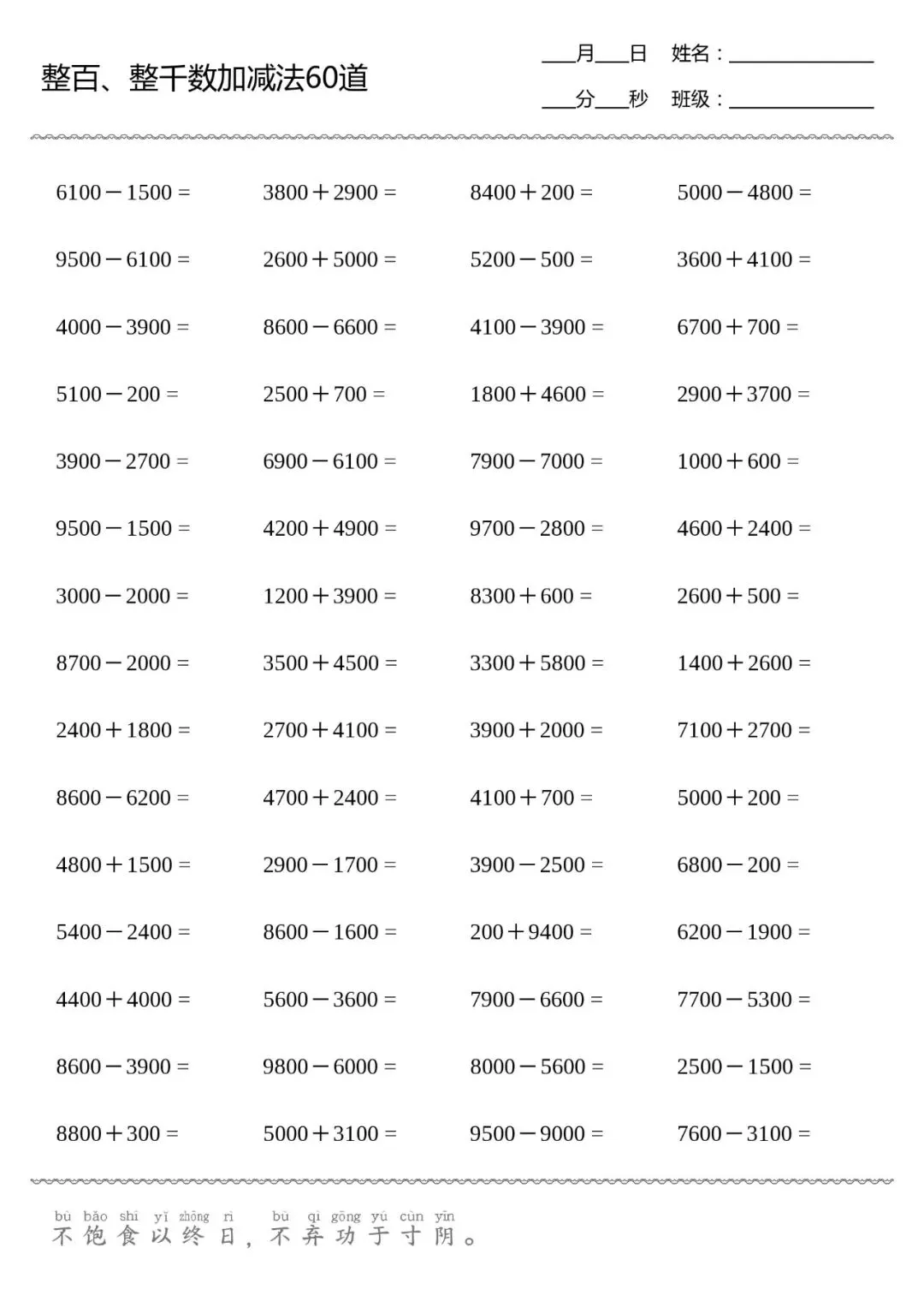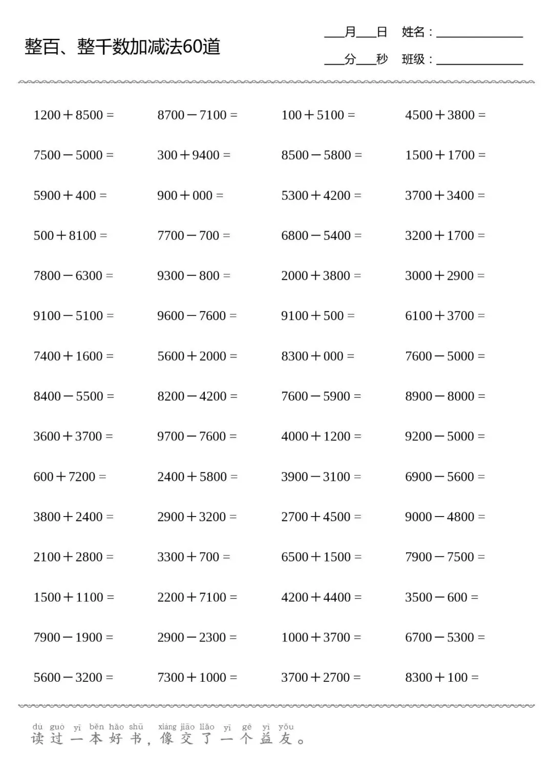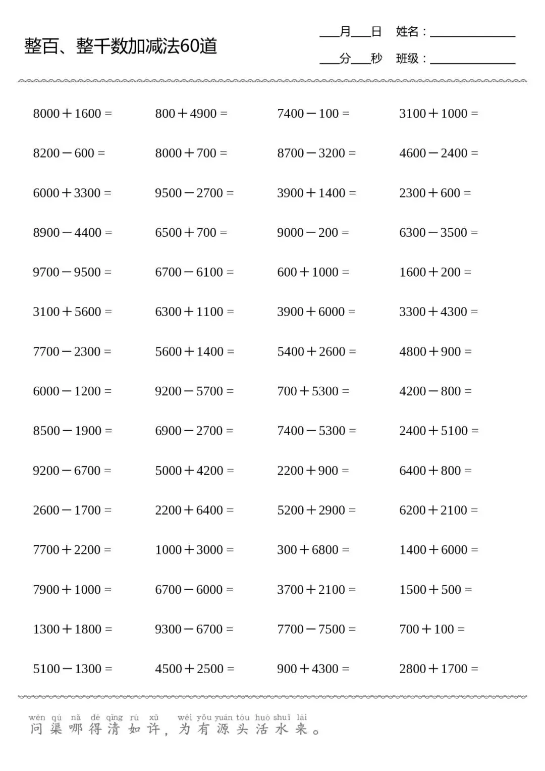 口算打卡 | 整百、整千加减法(共8张,可直接打印)