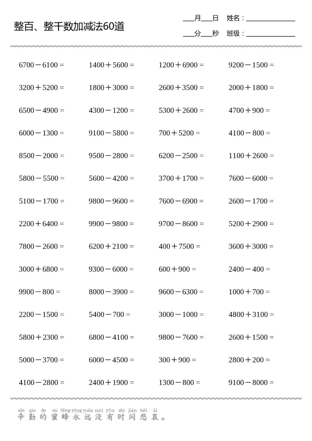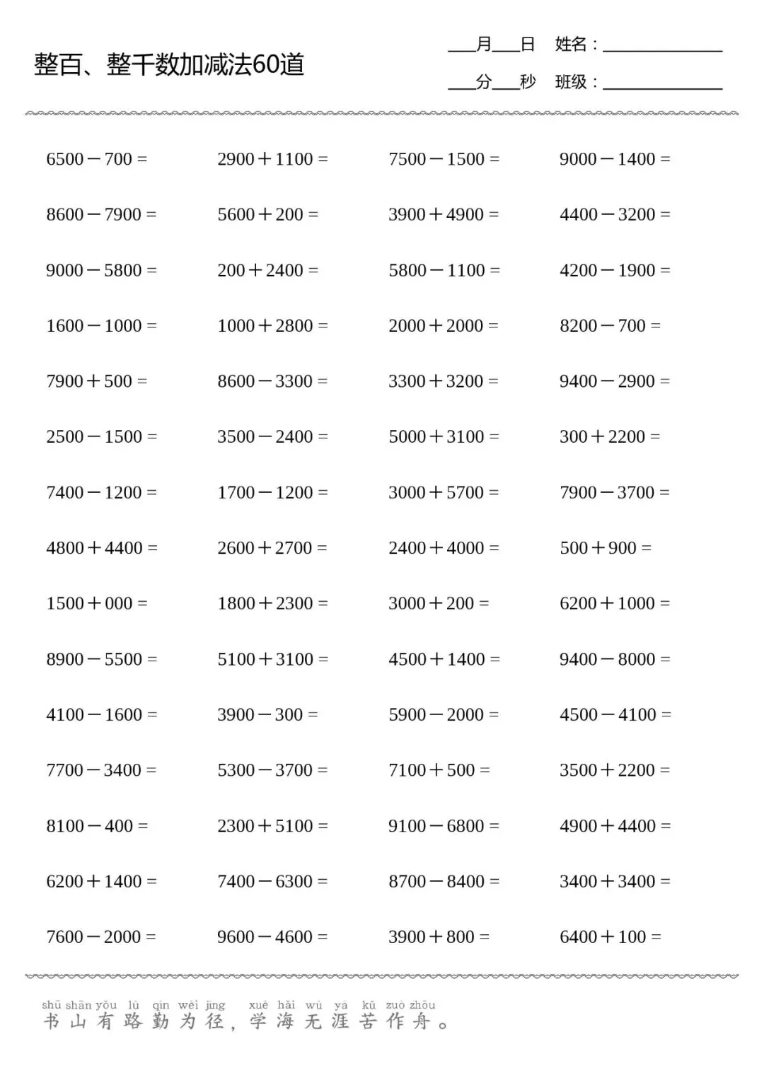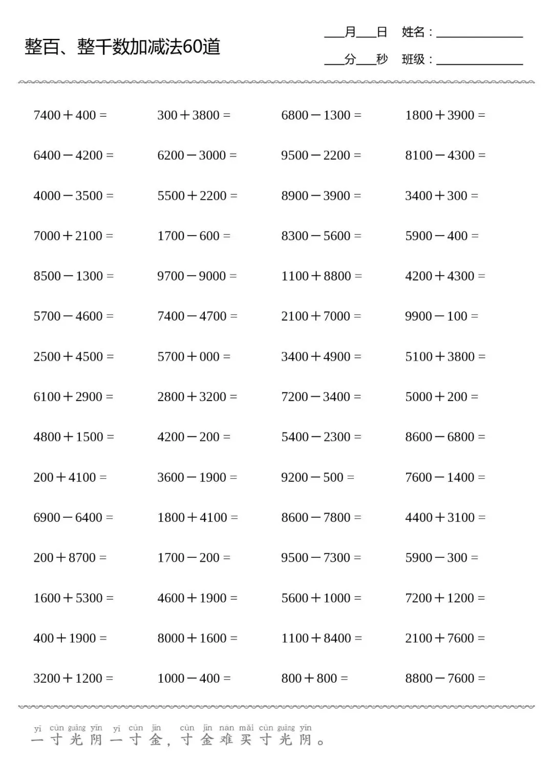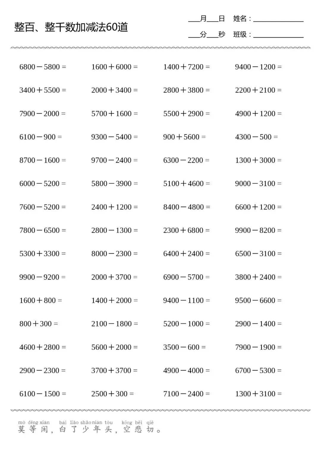 口算打卡 | 整百、整千加减法(共8张,可直接打印)