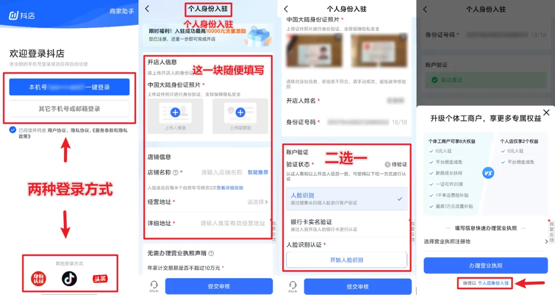 打开抖店APP,使用你的手机号登录。在身份选择界面,请务必选择【个人身份入驻】。