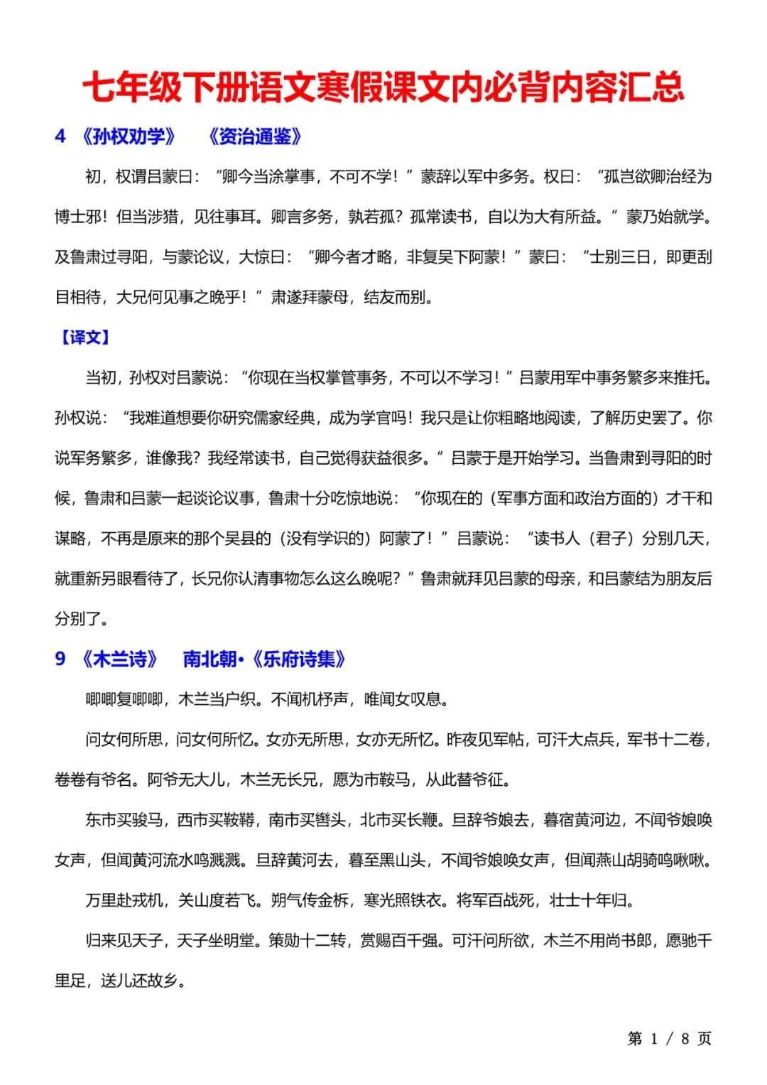 今天老师为大家整理好了:七年级下册语文必背课文清单电子版可打印