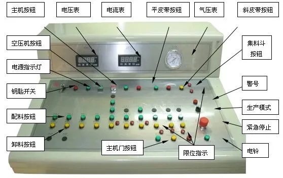 1、主机按钮:含启动、停止两个按钮,用于启动和停止搅拌主机,各种生产状态均有效。
