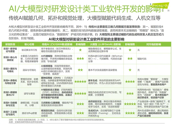 值得注意的是,《报告》在对新技术的分析中保持了一定的审慎态度。在探讨AI与大模型对工业软件的影响时,《报告》详细区分了传统AI与大模型在不同研发阶段的作用边界,强调技术应用需与实际场景深度结合。