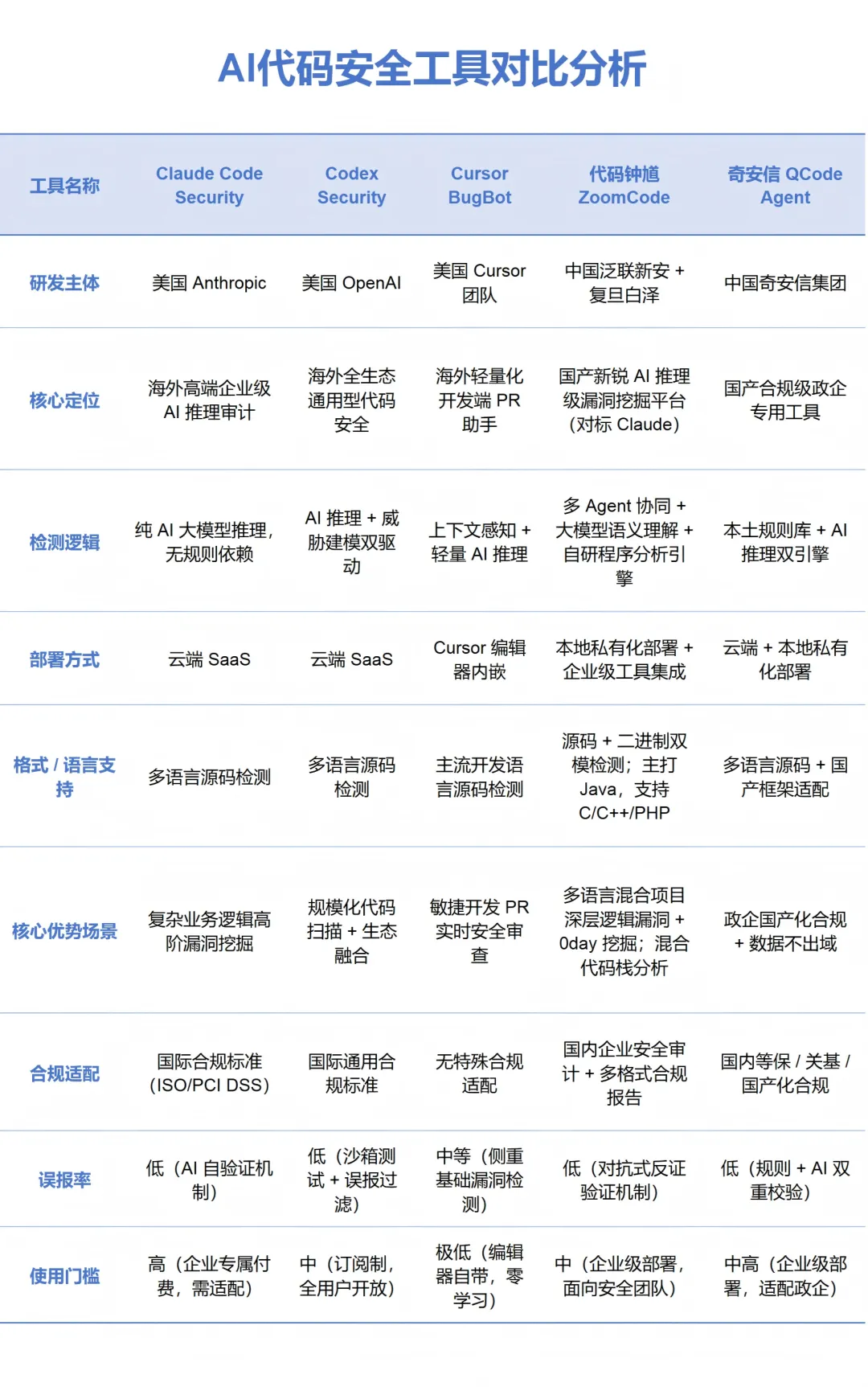 核心系统 / 上线阶段:用 Claude Code Security 或代码钟馗 ZoomCode 做深度审计,挖掘高阶隐蔽漏洞,构建主动防御体系;