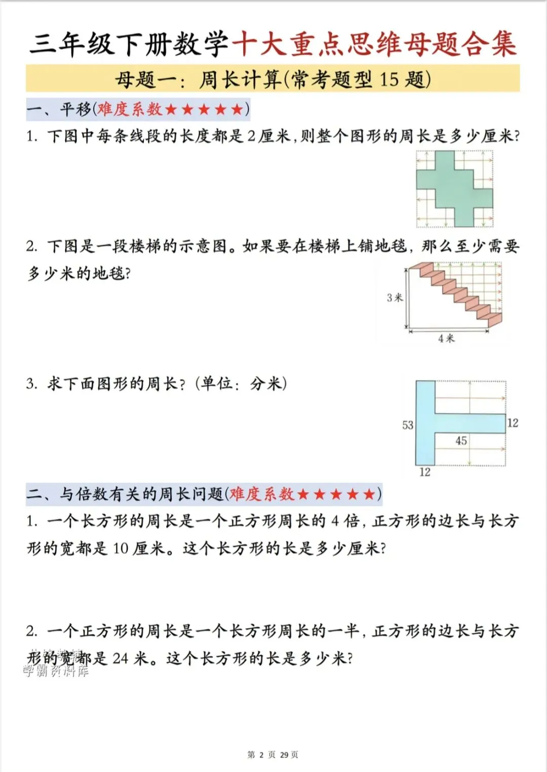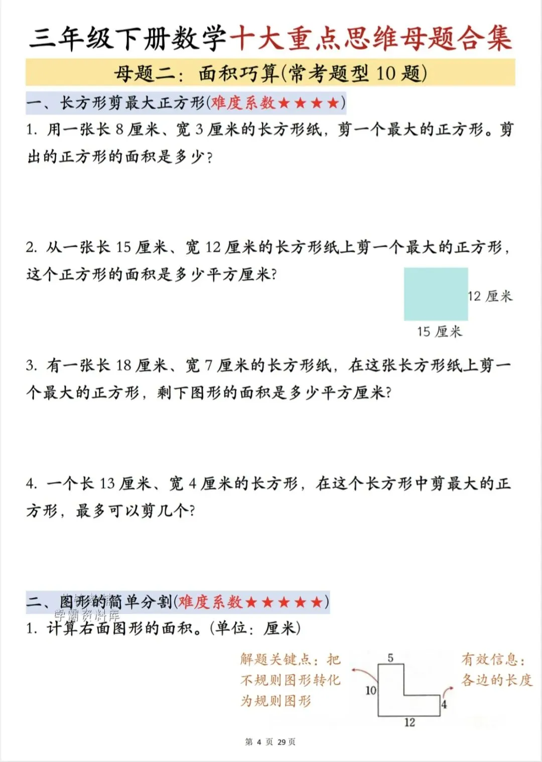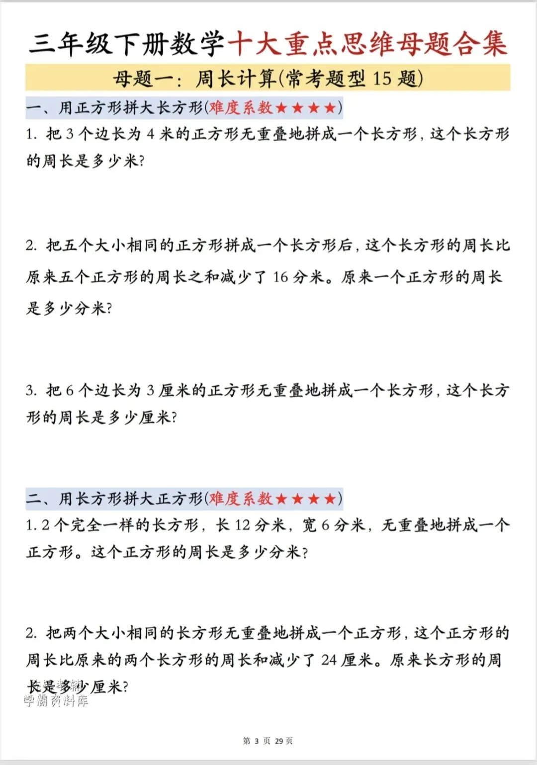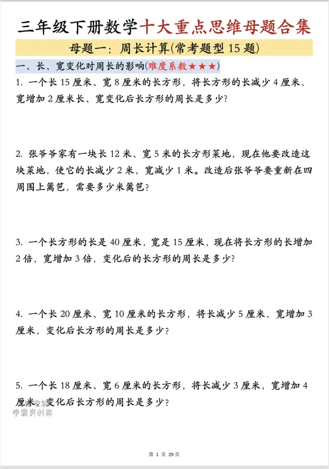 三年级下数学《十大重点思维母题合集》,共29页,电子版可下载打印,这份十大重点思维母题合集包含了:周长计算、面积巧算、周期问题、错中求解、盈亏问题、年龄问题、倍数问题、还原问题、归一问题、鸡兔同笼问题,都是往年常考题型,每天练一练提升孩子思维能力,为今后的数学学习打下坚实的基础。需要的家长可以打印出来,让孩子练一练。