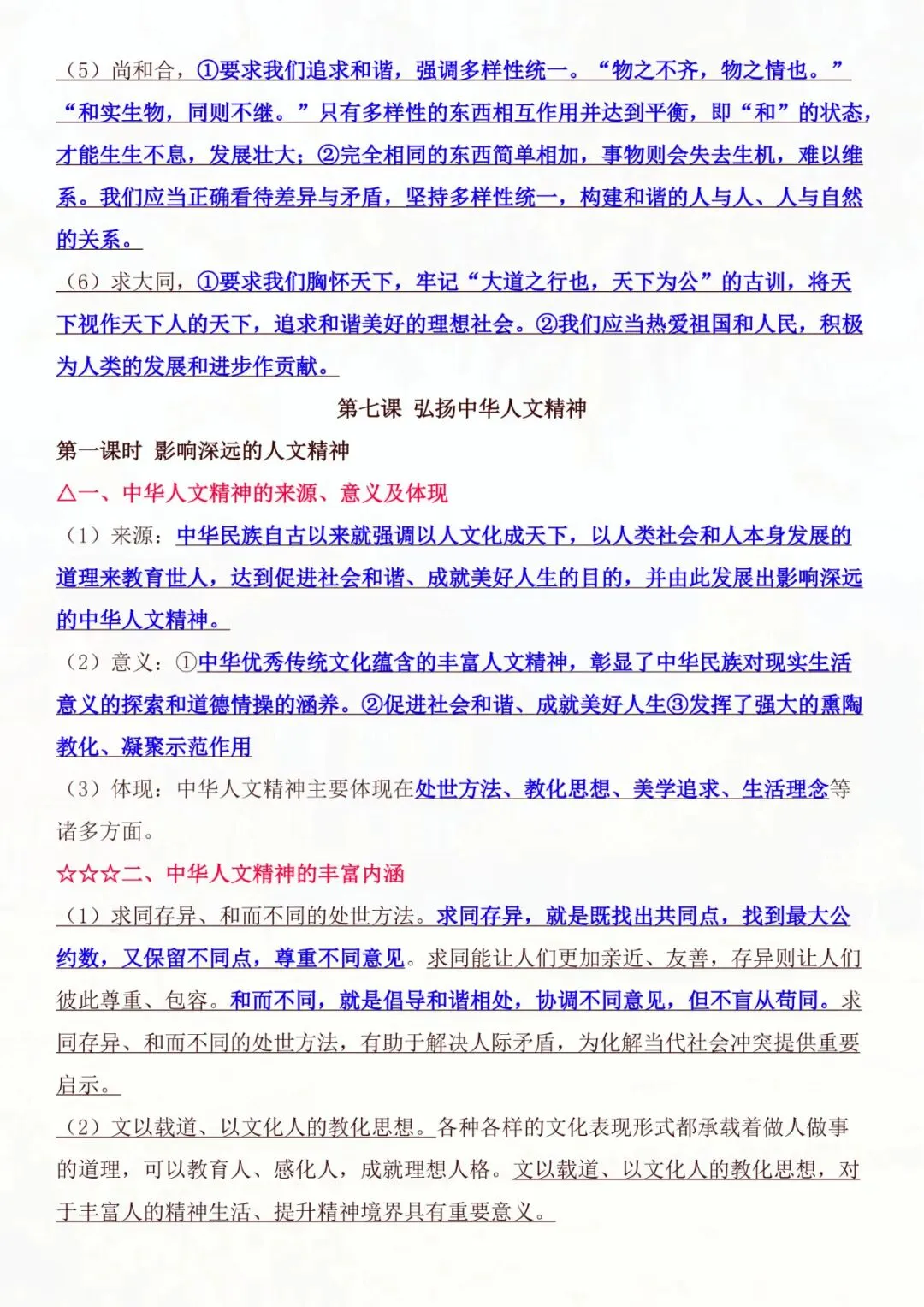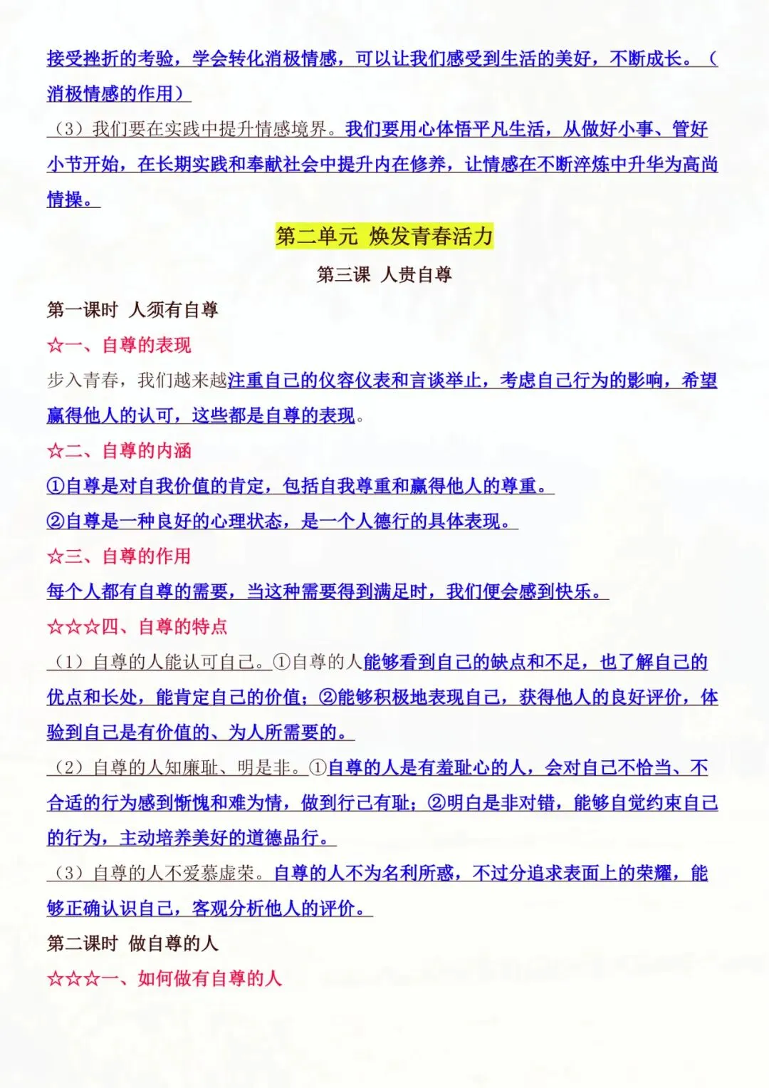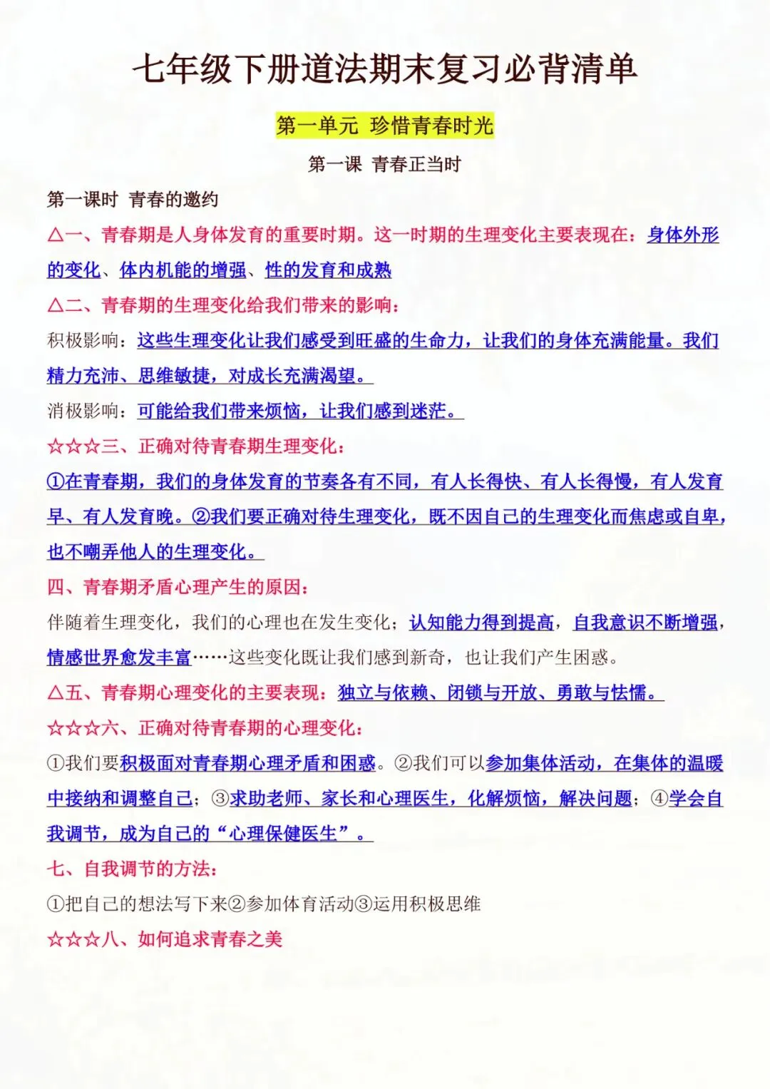 今天老师整理好了:七年级下册道法期末复习必背清单 电子版可打印!