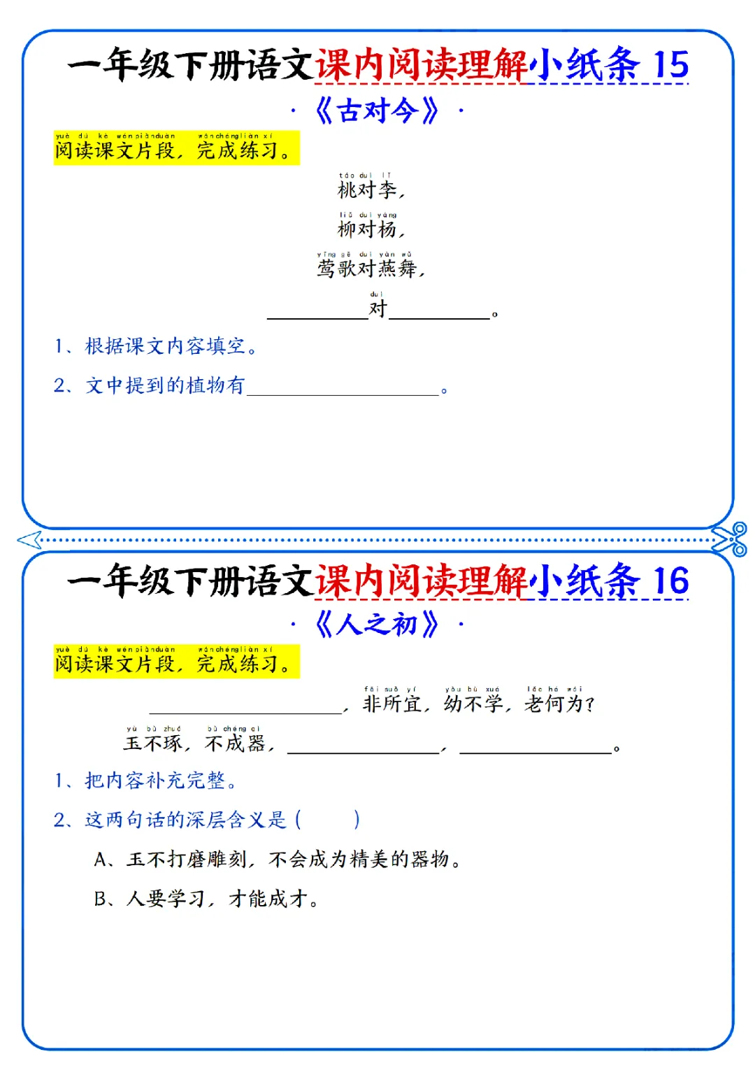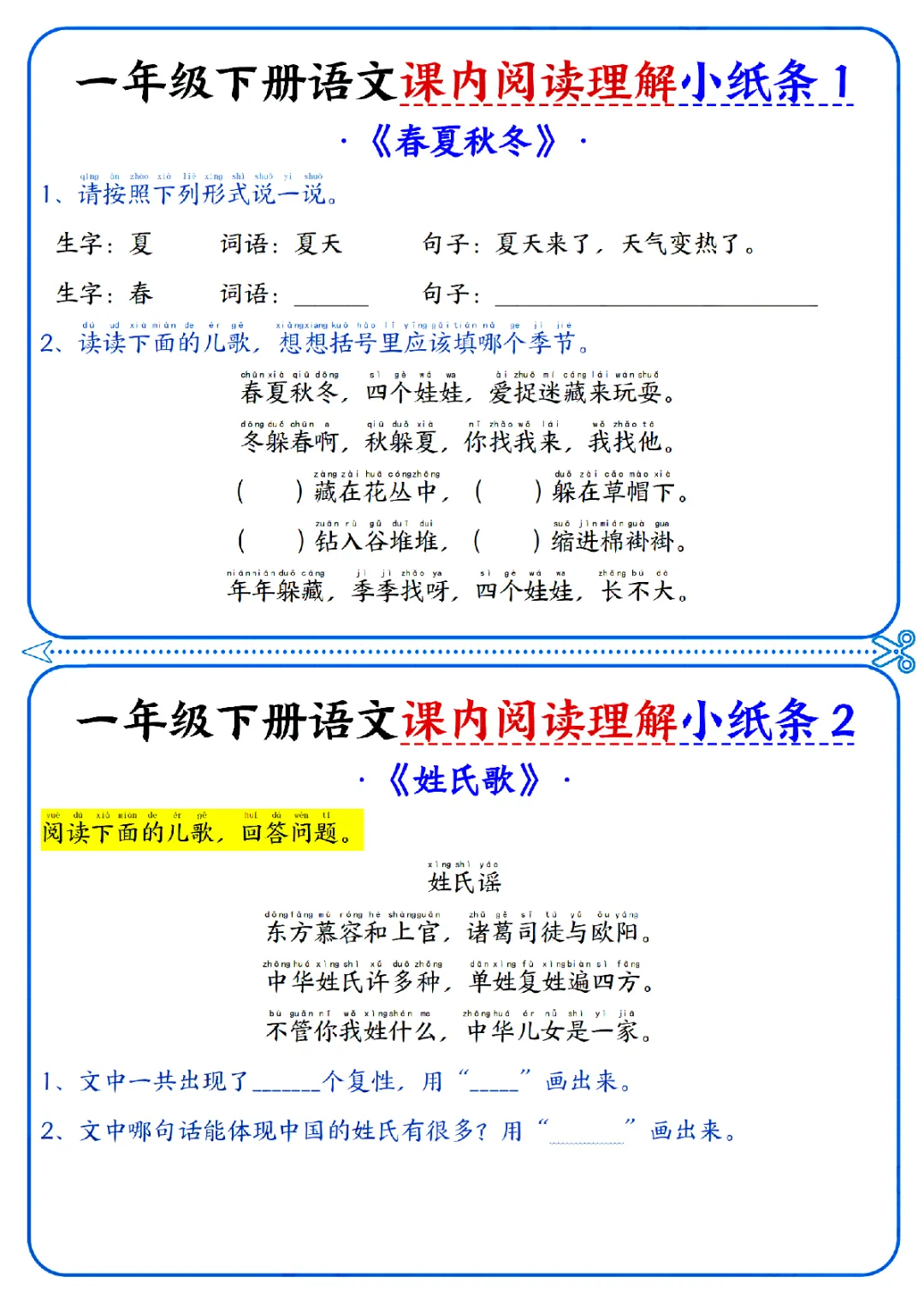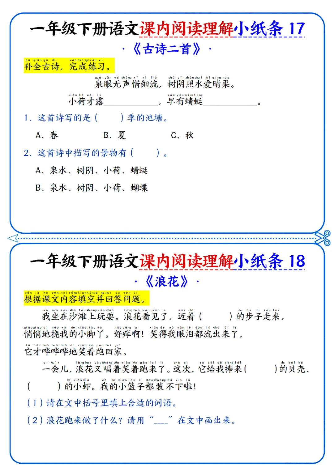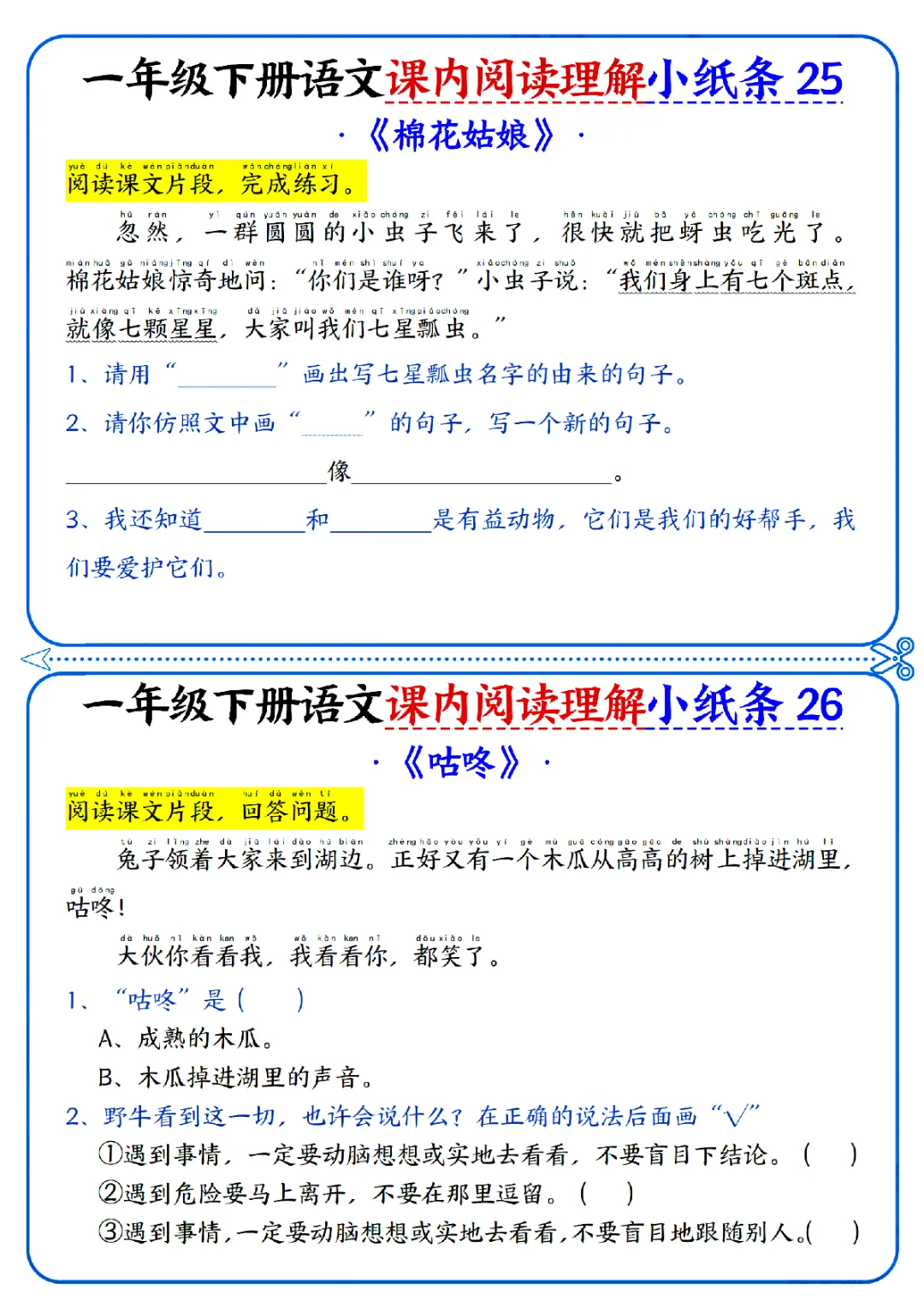 2026年一年级下册语文课内阅读小纸条|电子版可打印