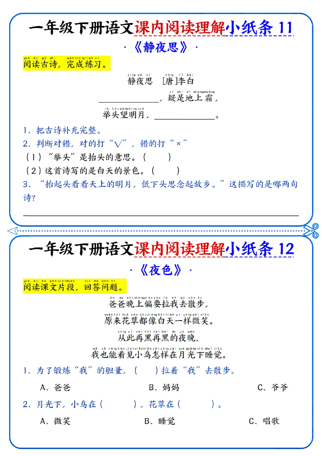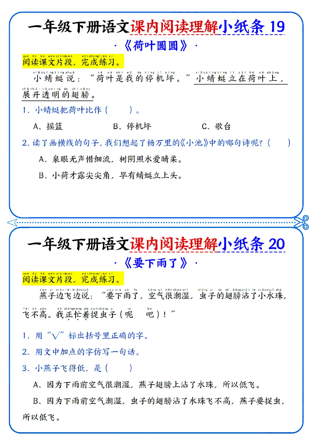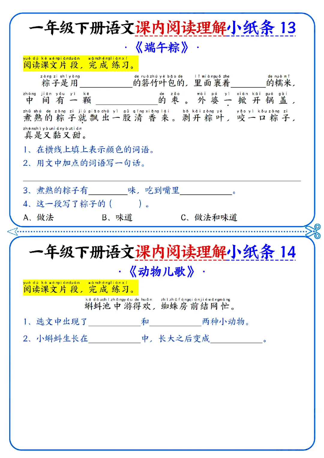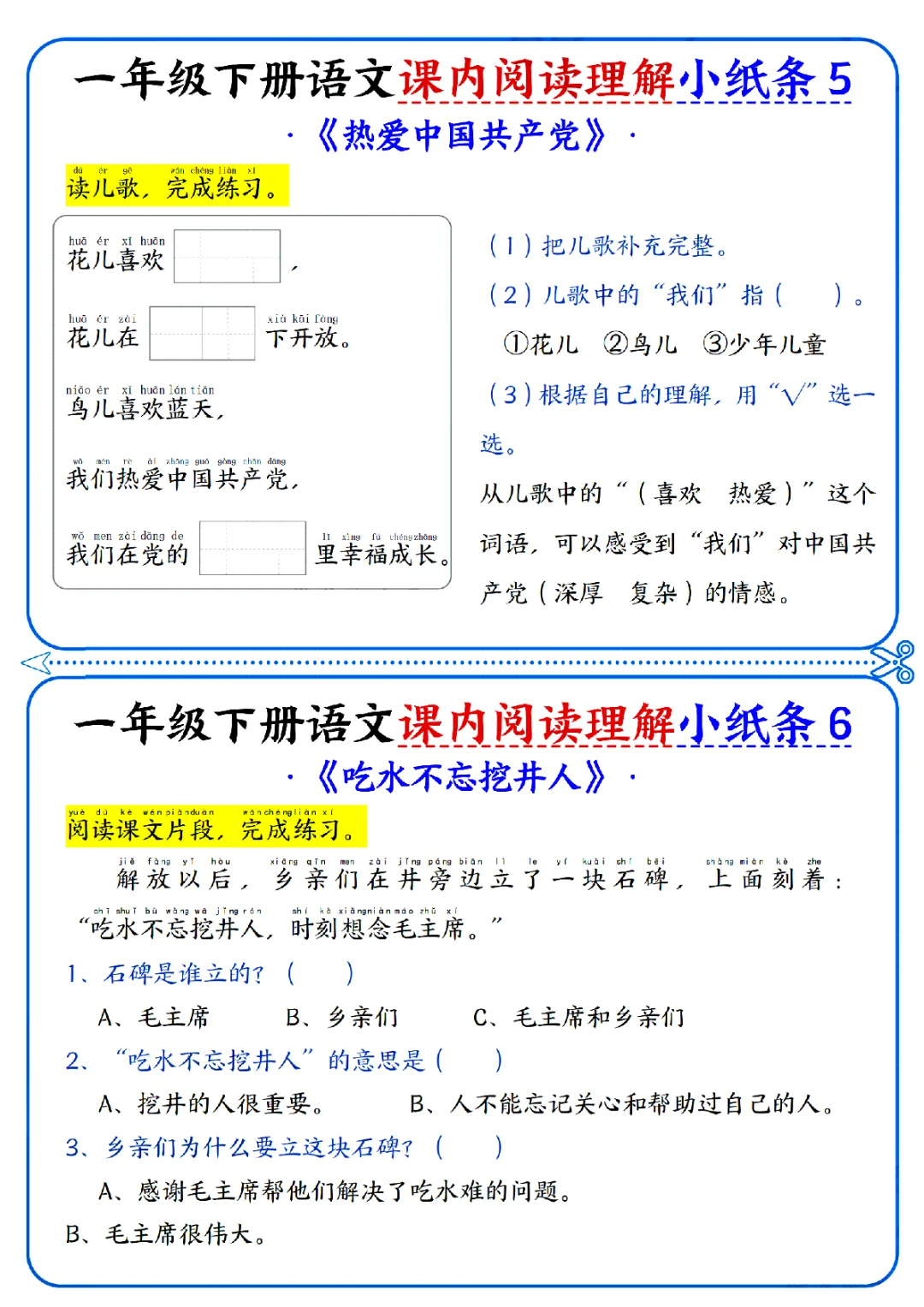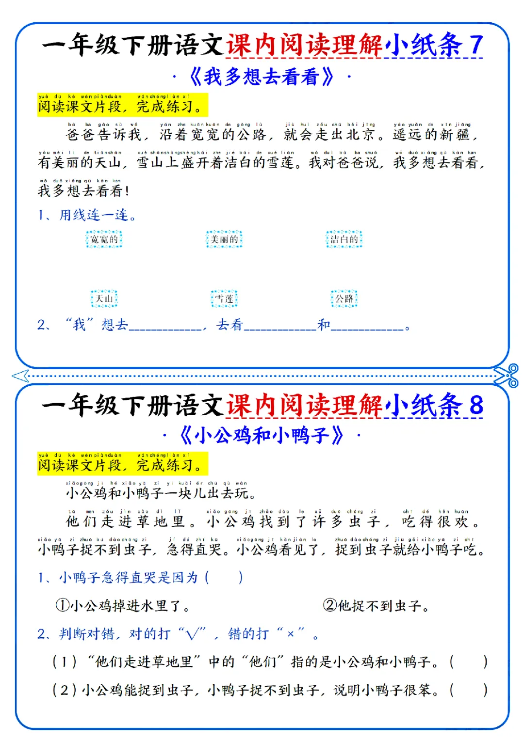 2026年一年级下册语文课内阅读小纸条|电子版可打印
