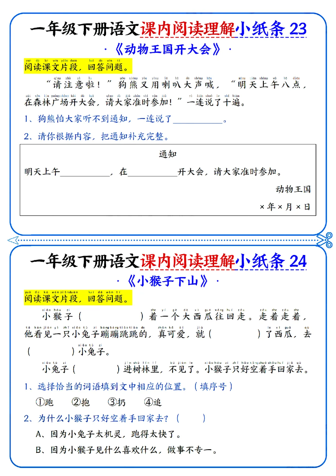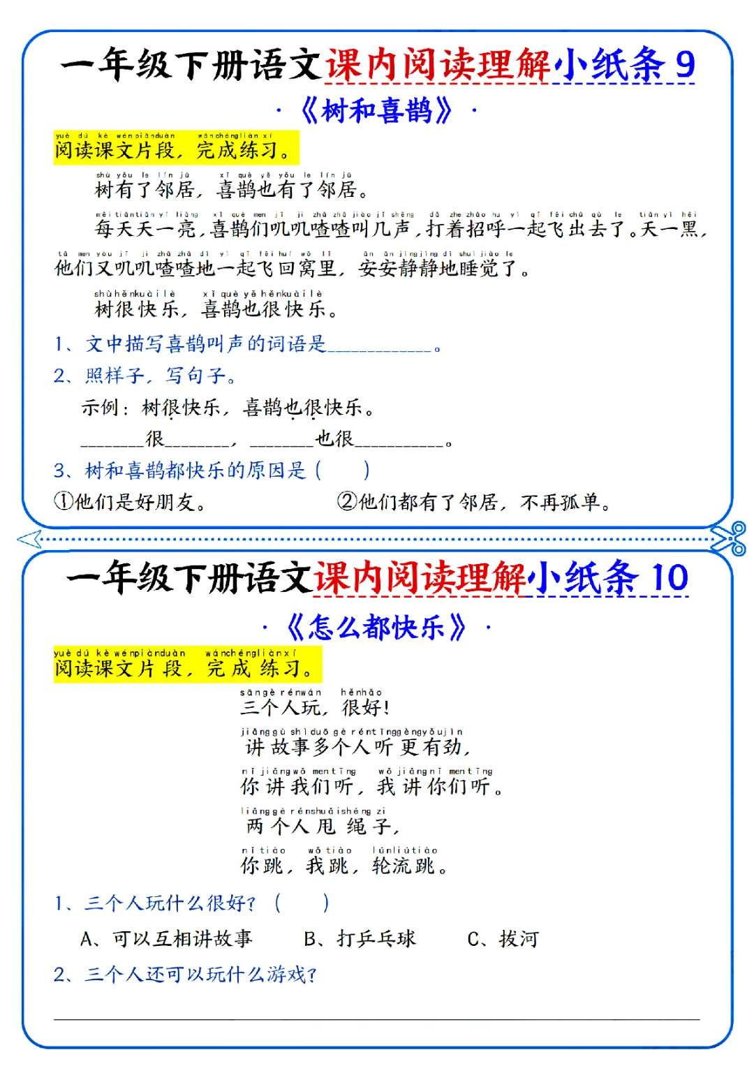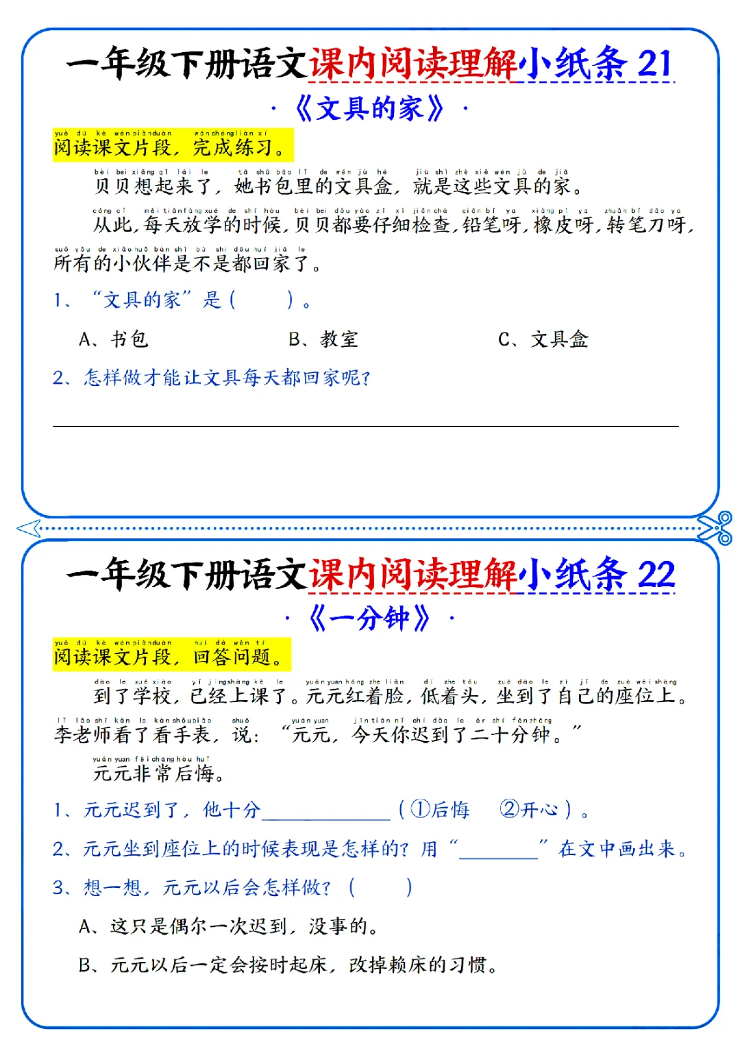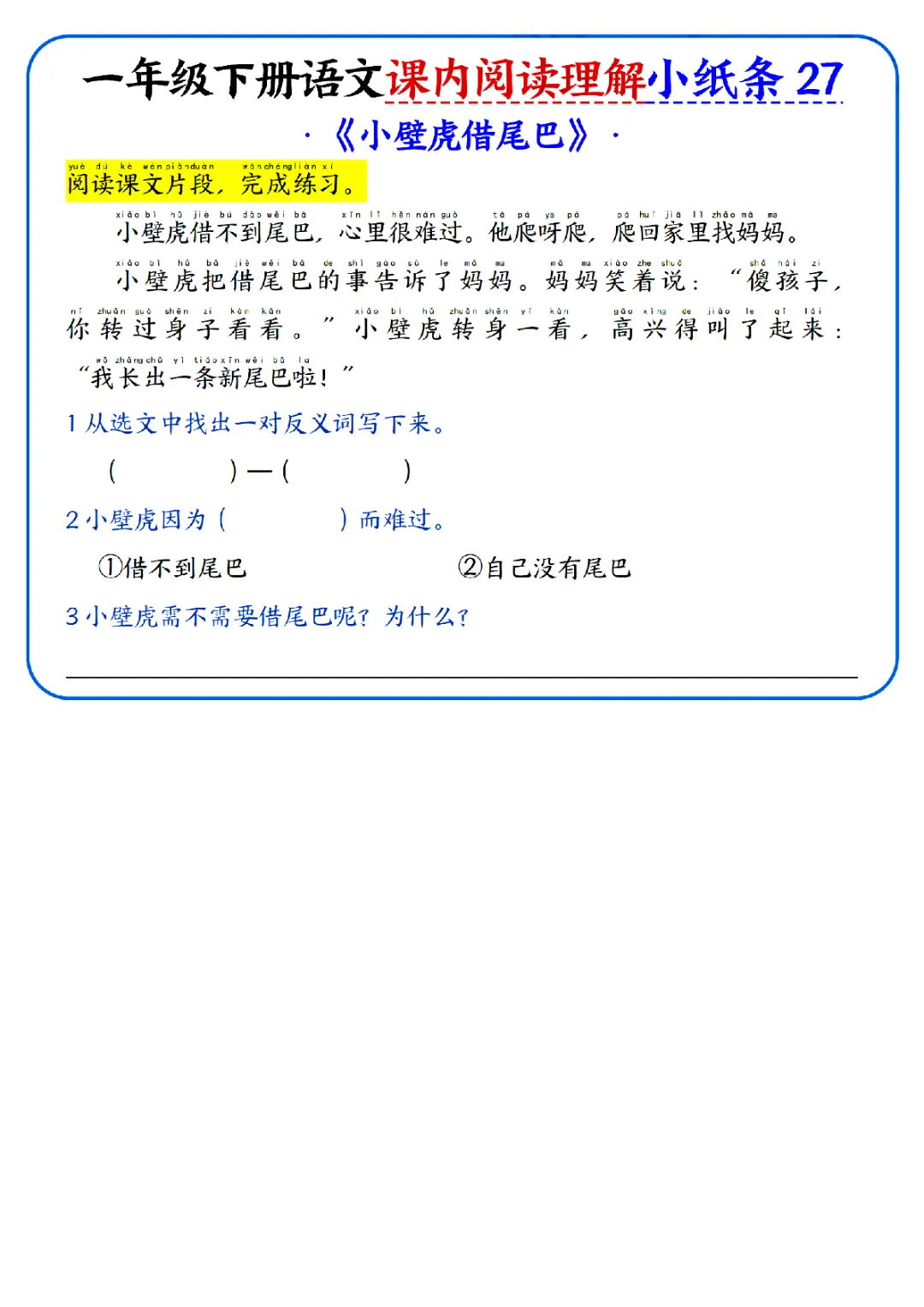 2026年一年级下册语文课内阅读小纸条|电子版可打印
