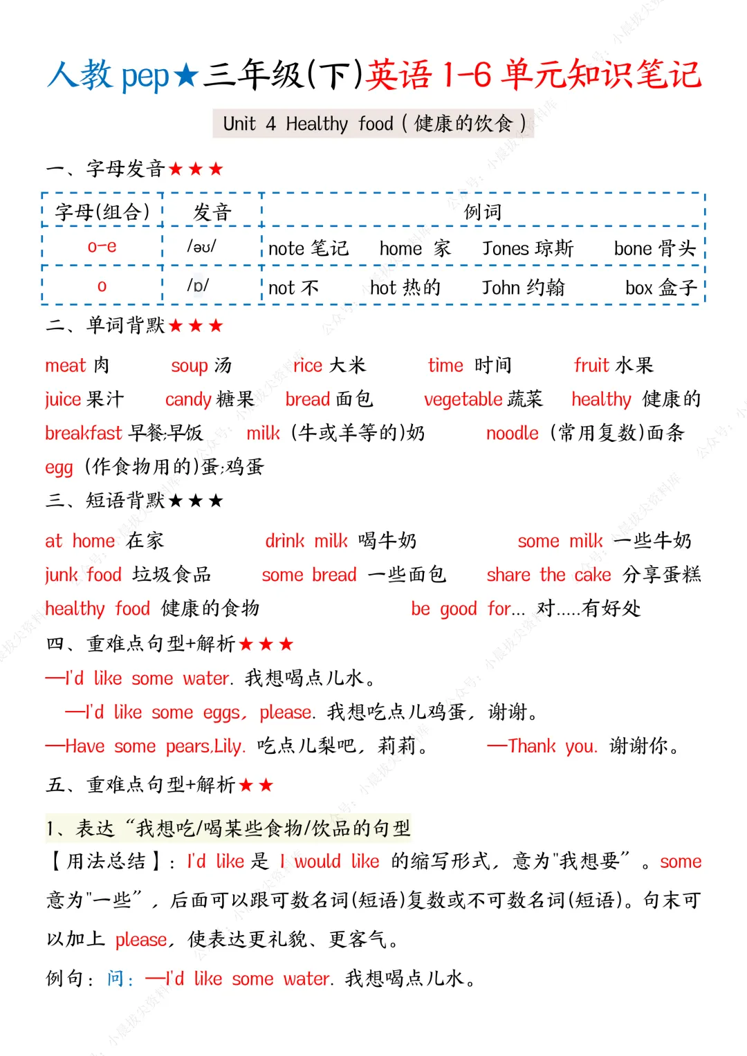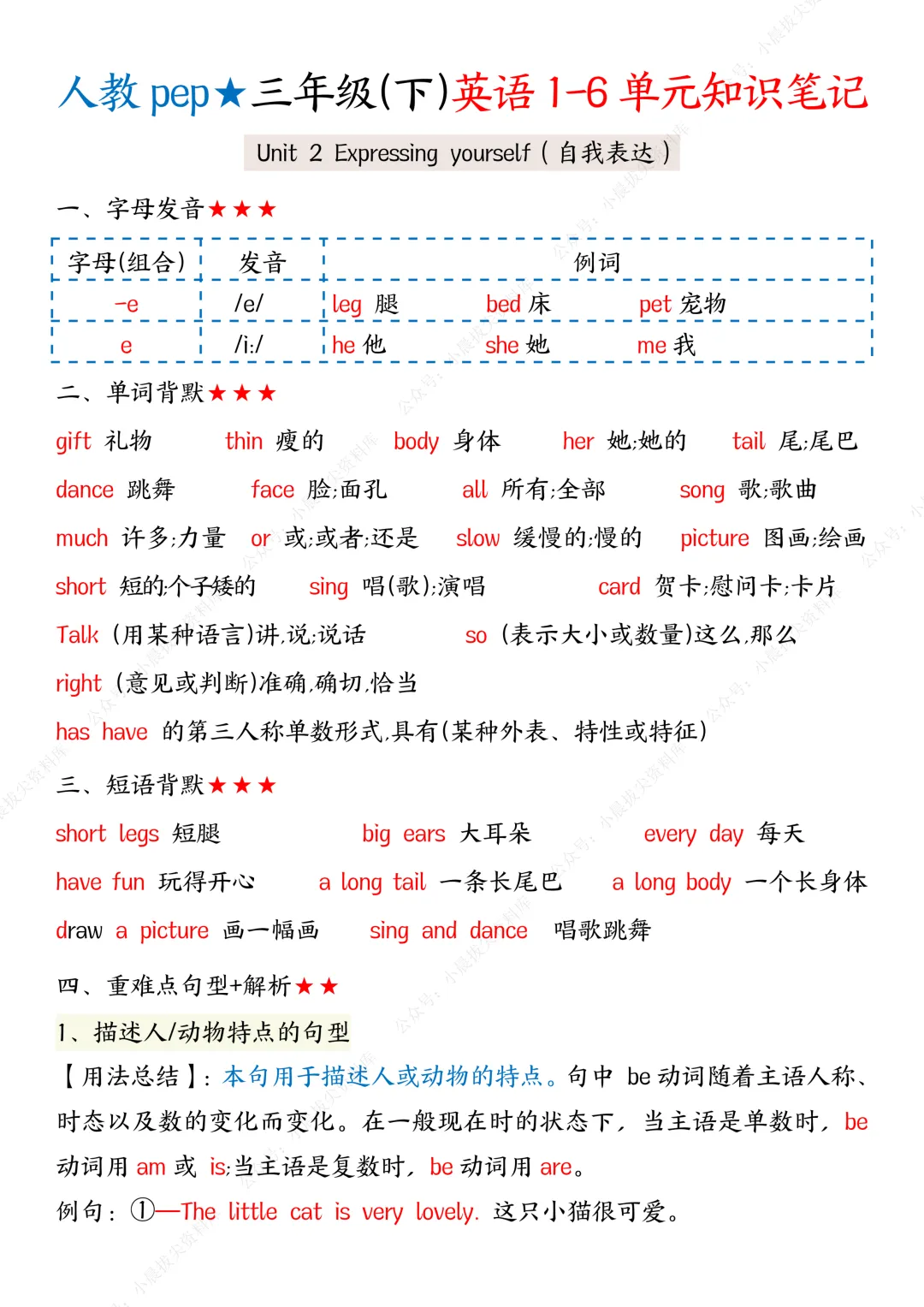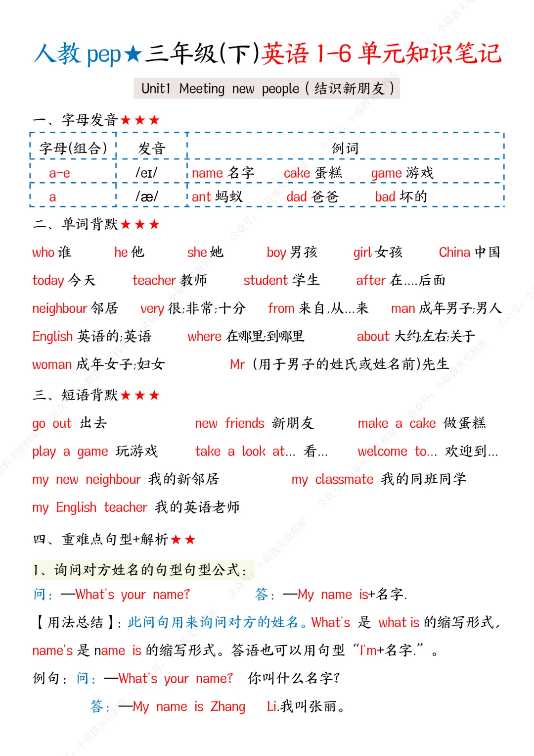 三年级下册英语人教pep版1-6单元知识笔记,单元知识点梳理,人教版三下英语单元知识归纳(可打印) 人教pep版三年级英语下册1-6单元知识点笔记归纳,老师给整理出来了,涵盖字母发音、单词、短语及常考句型,需要的家长打印出来给孩子读一读背一背,为本学期打好基础! 【部分页面展示】: ✔【完整电子版,长按二维码获取】: