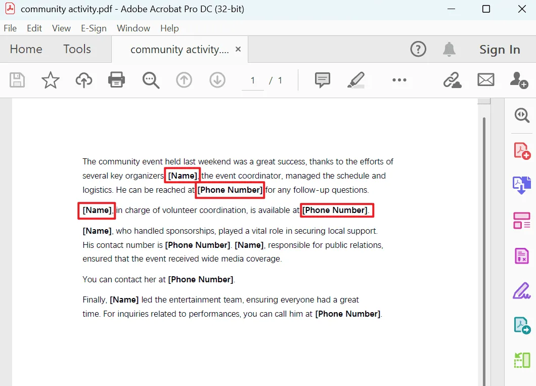 处理有着个人数据的 PDF 文件时,可能会需要批量模糊替换姓名、身份号码或电话号码等内容,比如一份客户名单中出现大量的人名以及联系方式,为了保护这些隐私,我们可以将所有姓名替换成 Name,号码替换成 Phone Number。