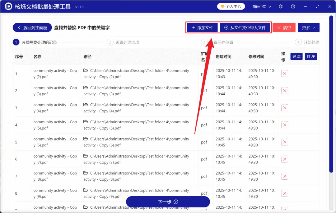 2、在【添加文件】或【从文件夹中导入文件】中选择一个方式进行添加,也可以直接将文件拖入下方导入,确认文件没有问题后,点击下一步。