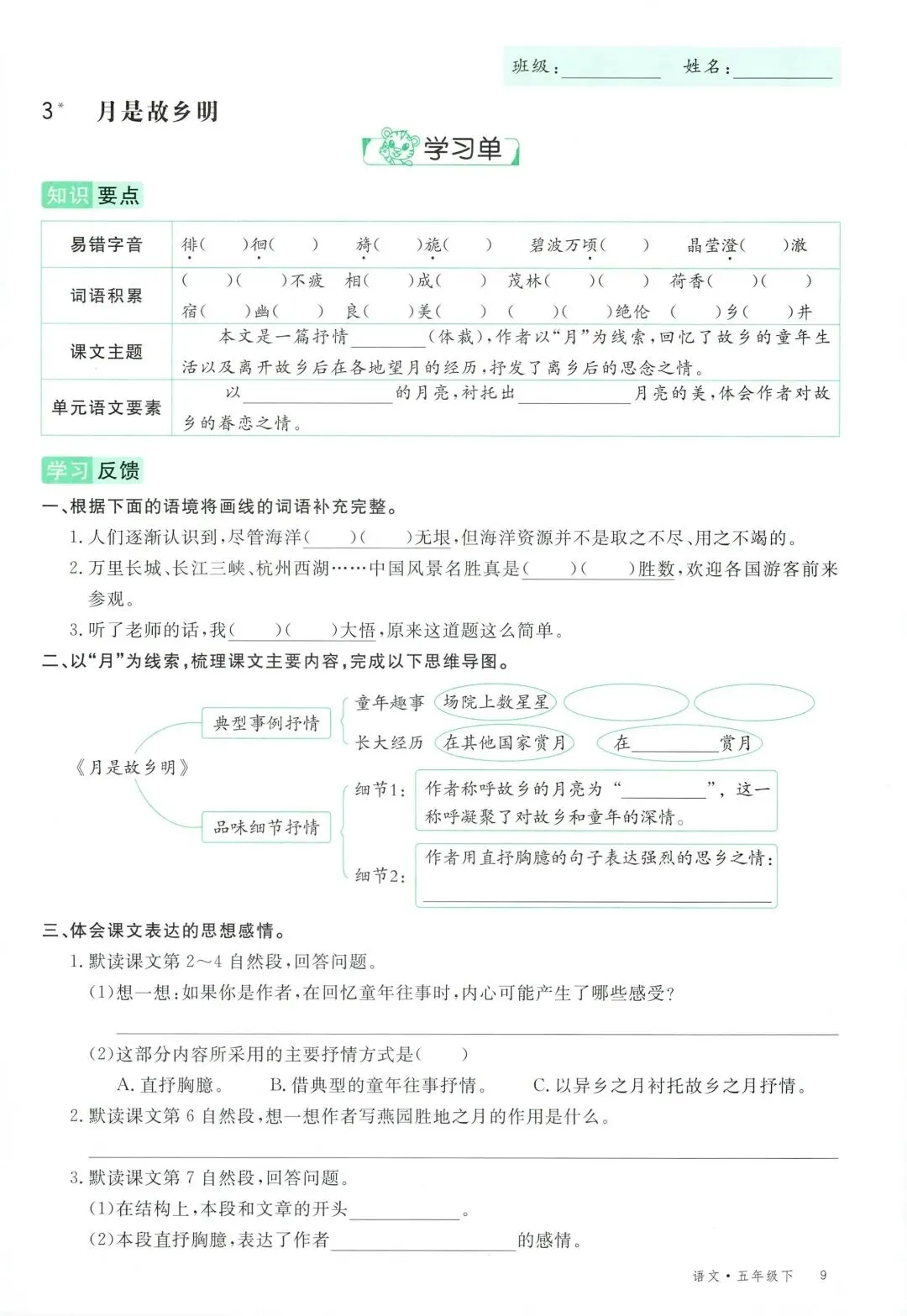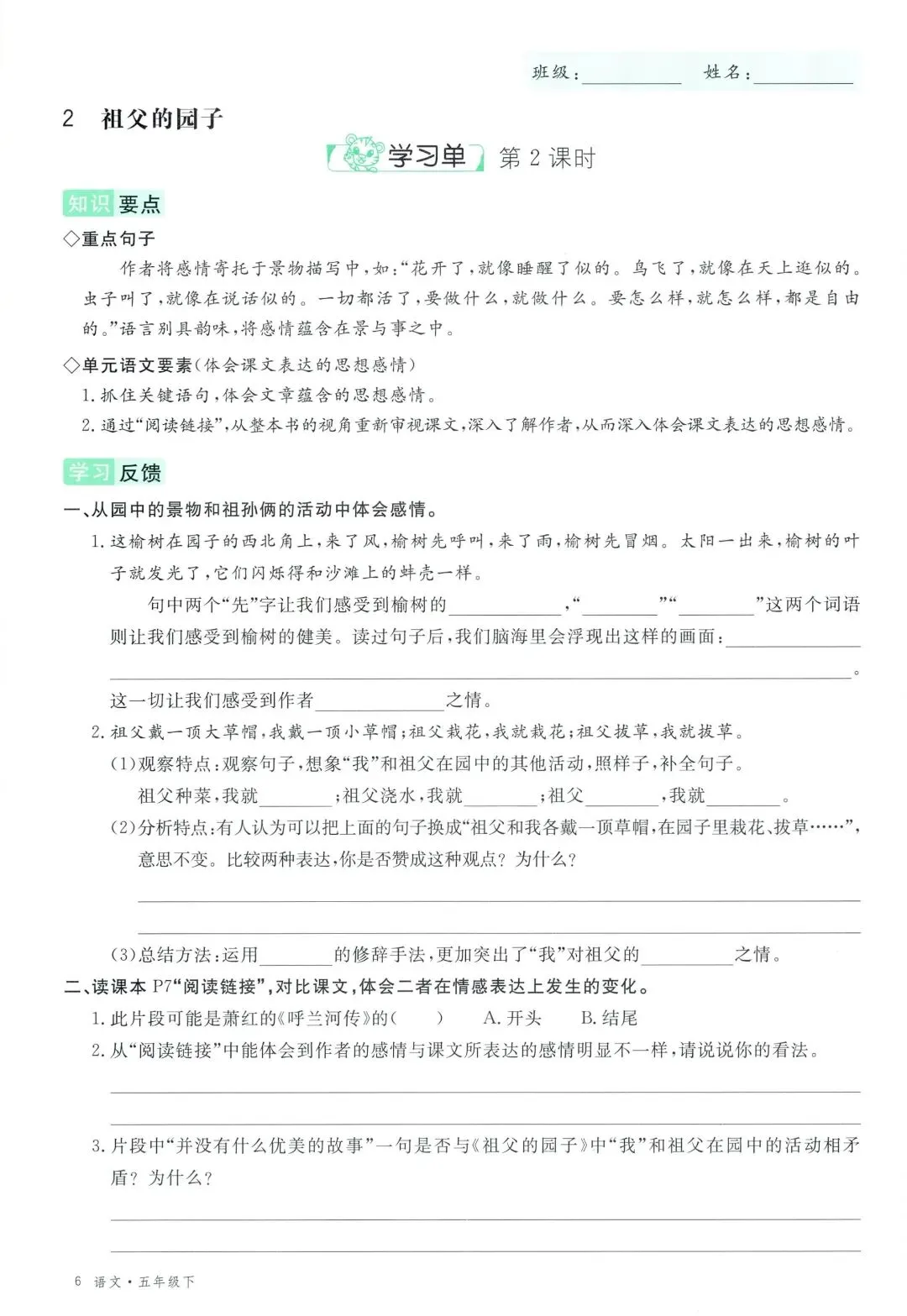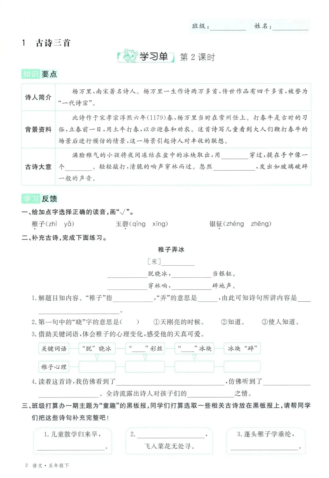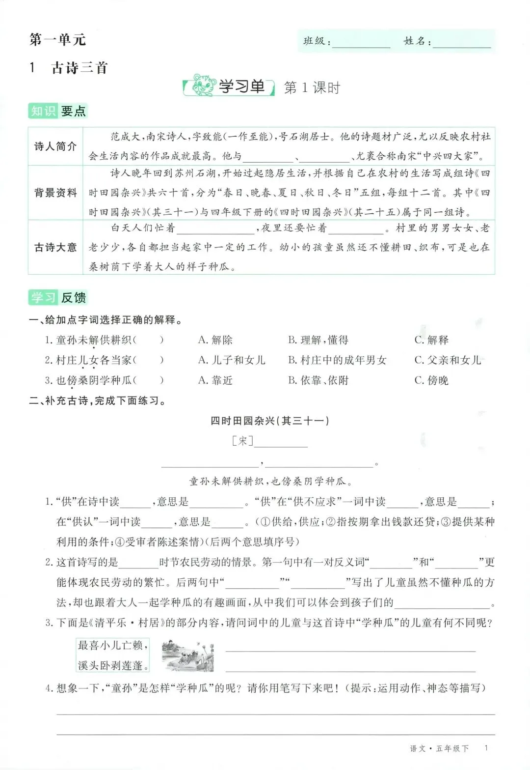 可打印!2026 春季五年级下册语文全册学习单,同步教材全覆盖