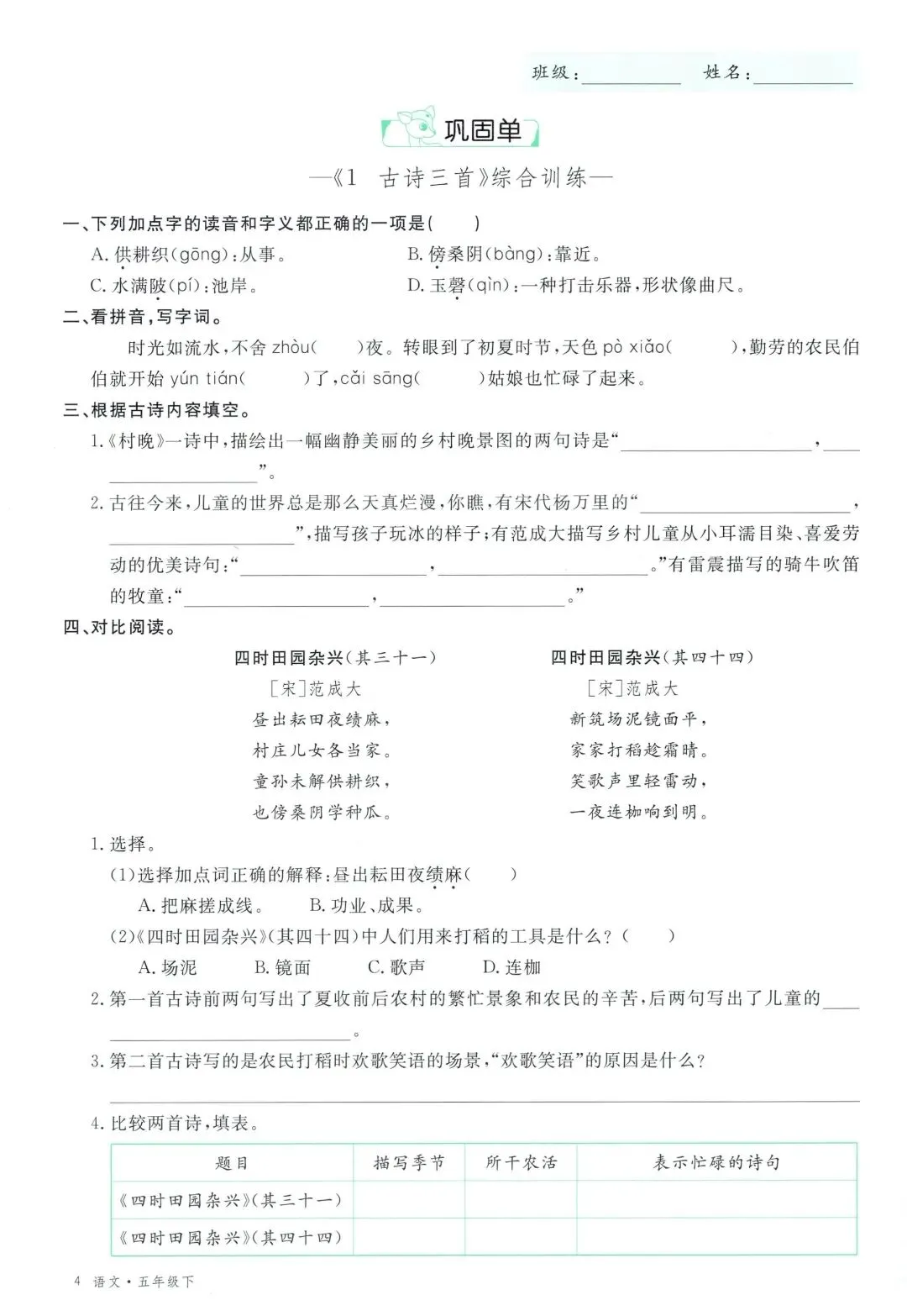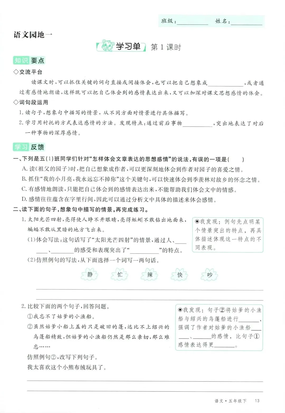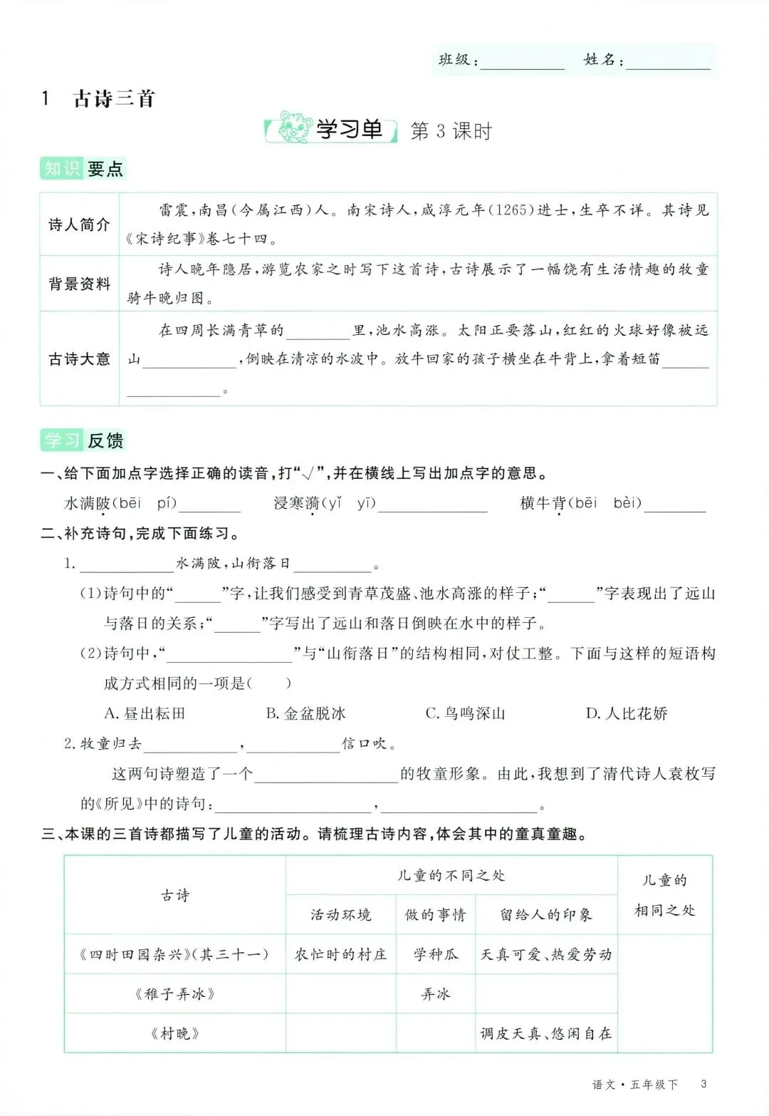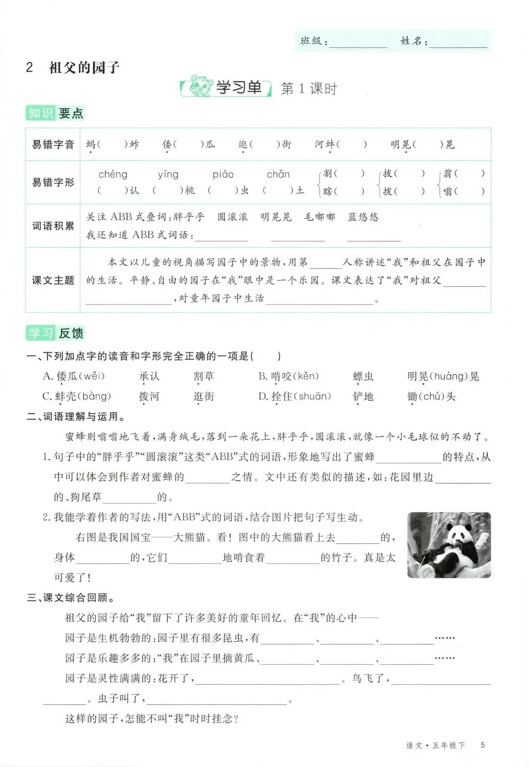 可打印!2026 春季五年级下册语文全册学习单,同步教材全覆盖