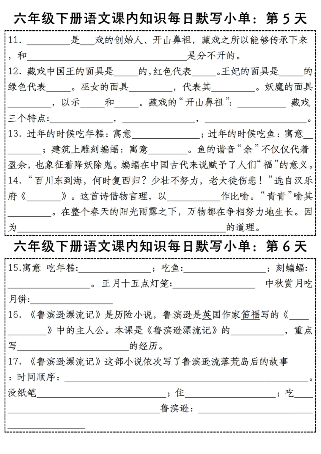 【免费下载】六年级(下)语文 每日课内知识默写小单 电子版